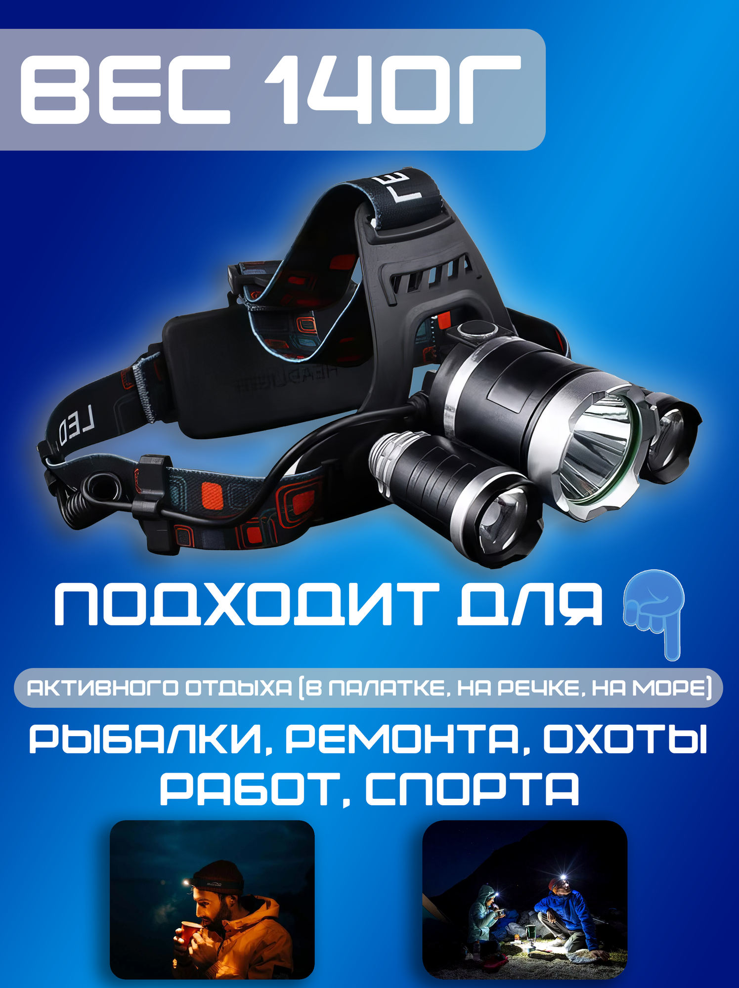 Фонарь налобный яркий мощный светодиодный для рыбалки, охоты туризма и отдыха LED HEADLIGHT информация: