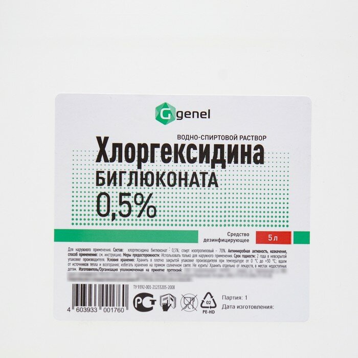 Хлоргексидина биглюконата водно-спиртовой дезенфицирующий раствор 0,5%, 5 л информация: