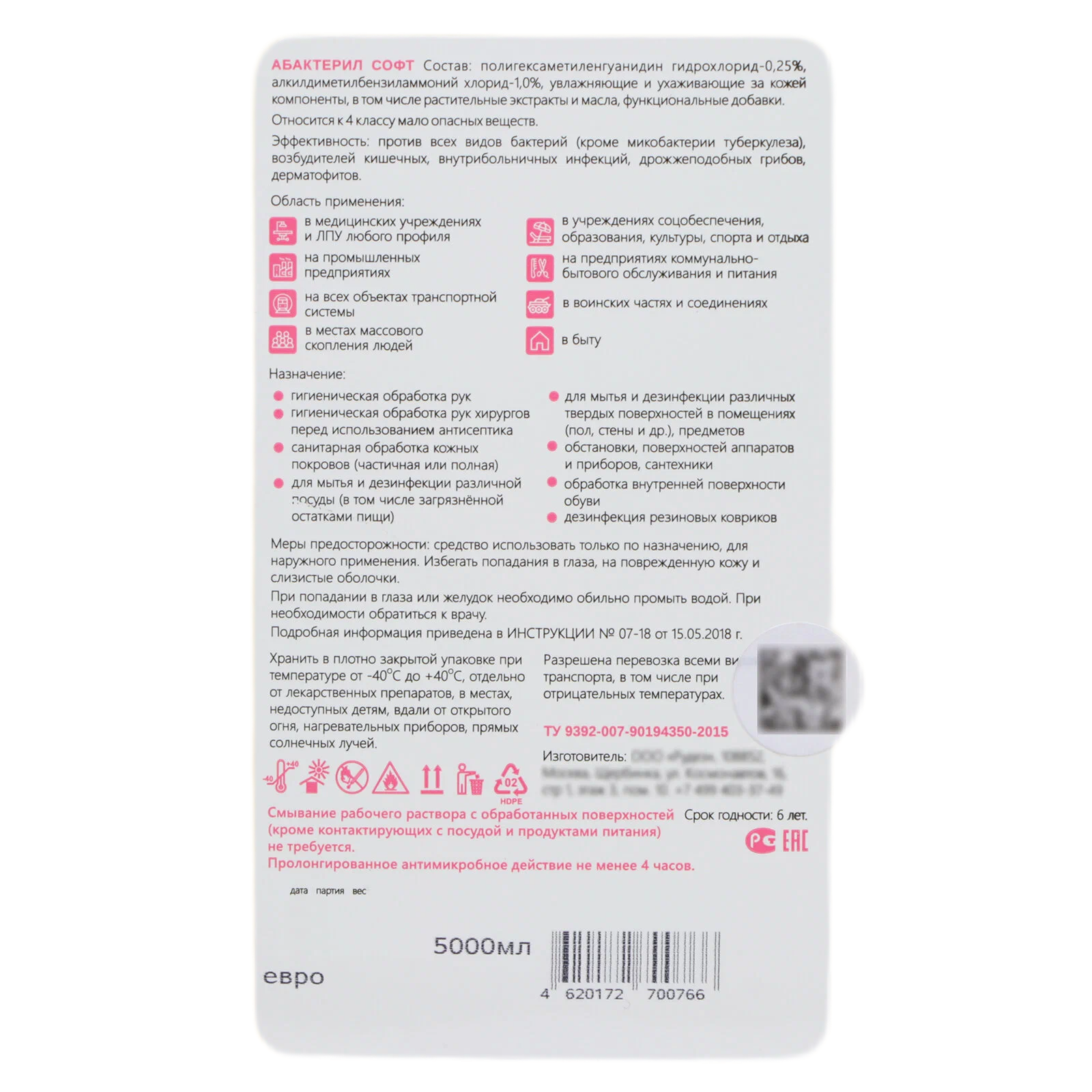 | Основное действующее вещество | алкилдиметилбензиламмоний хлорид (АДБАХ) / полигексаметиленгуанидин гидрохлорид |