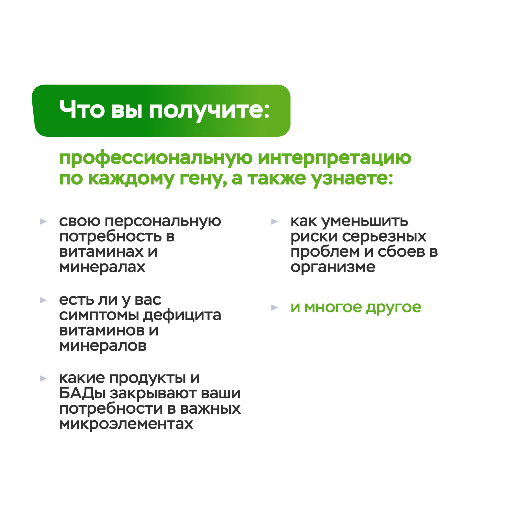 ДНК-тест MyGenetics, MyVitamins - индивидуальная потребность в витаминах и минералах информация: