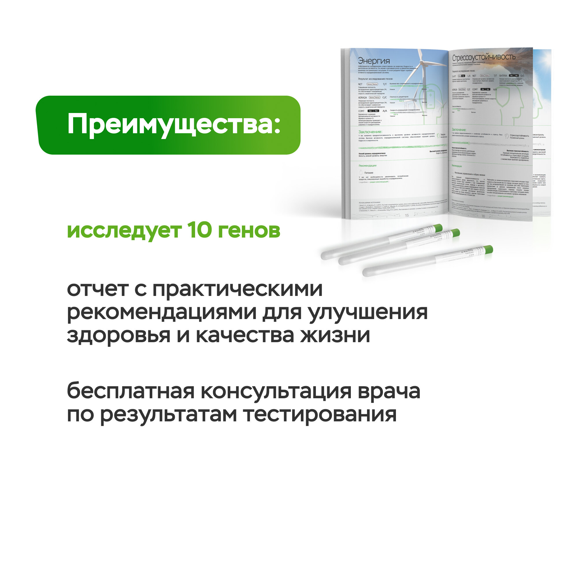 ДНК-тест MyGenetics MyFit. Особенности организма, сохранение здоровья, рекомендации по питанию и физическим нагрузкам.