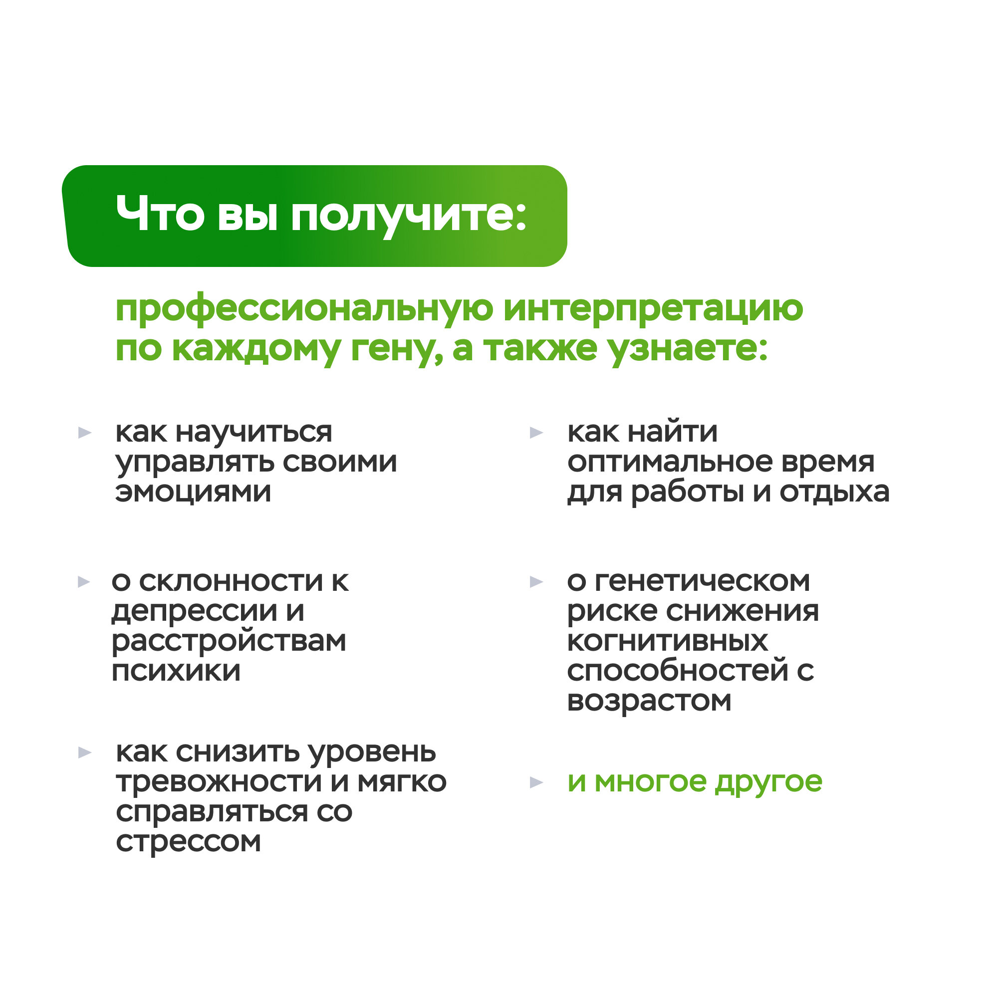 ДНК-тест MyGenetics MyNeuro. Генетические особенности эмоций, поведения и эффективности работы мозга информация: