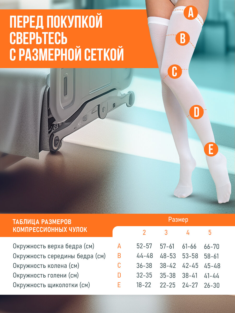 | Дополнительная информация | не нужно натягивать чулки слишком высоко – резинка должна находиться на 15 см ниже ягодичной складки |