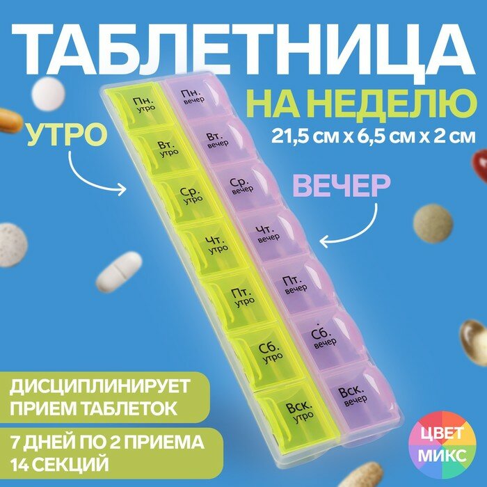 10 цен на Таблетница - органайзер «Неделька», русские буквы, утро/вечер, 21,5 × 6,5 × 2 см, 14 секций, цвет микс