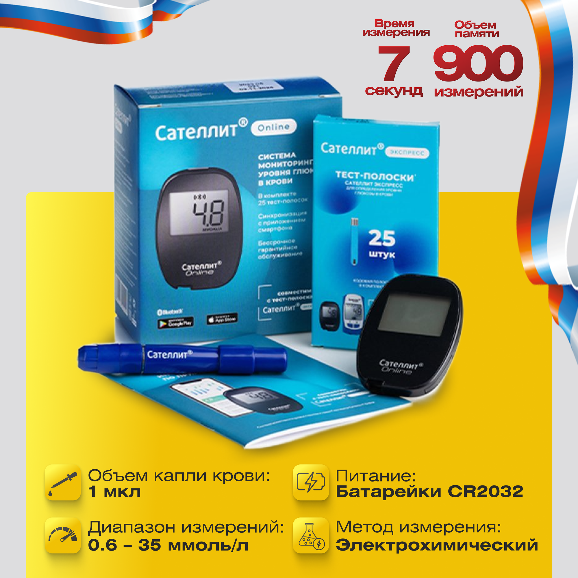 | Комплектация | • Глюкометр Сателлит Online (Онлайн), • тест-полоски Сателлит Экспресс (25 шт.), • батарейка, • мягкий чехол для прибора, • ручка для прокалывания автоматическая Сателлит, • полоска Контроль, • гарантийный талон, • инструкция по эксплуатации. |