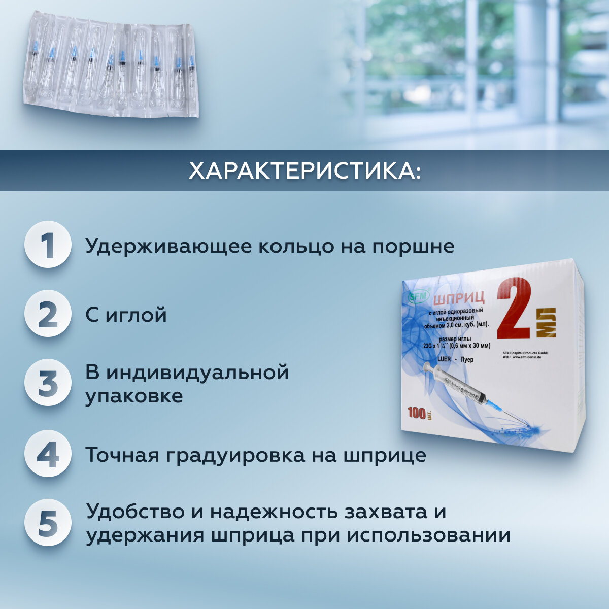| Особенности шприца | не содержит латекс / поршень с ограничителем хода |