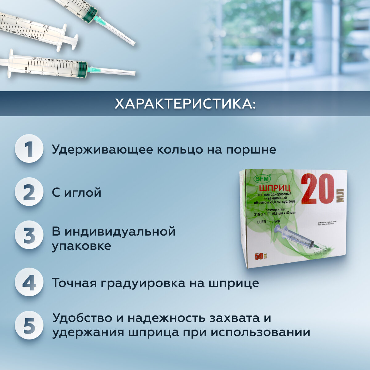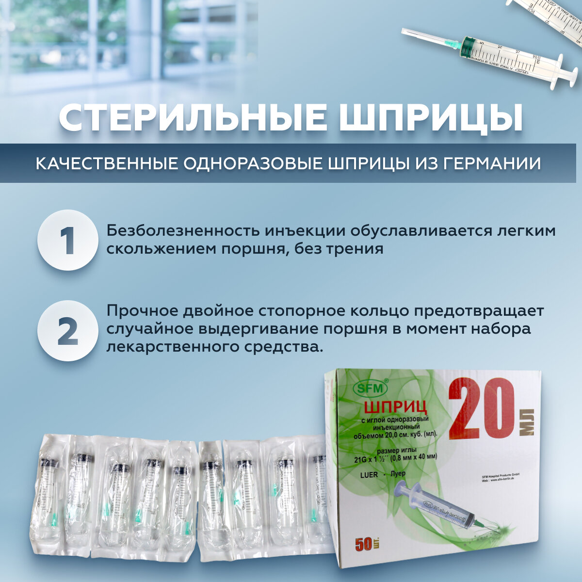 Шприц 20 мл трехкомпонентный, медицинский, для инъекций и уколов, с иглой крепление луер 0,8 x 40 - 21G, SFM Hospital Products GmbH, Германия, 50 штук информация: