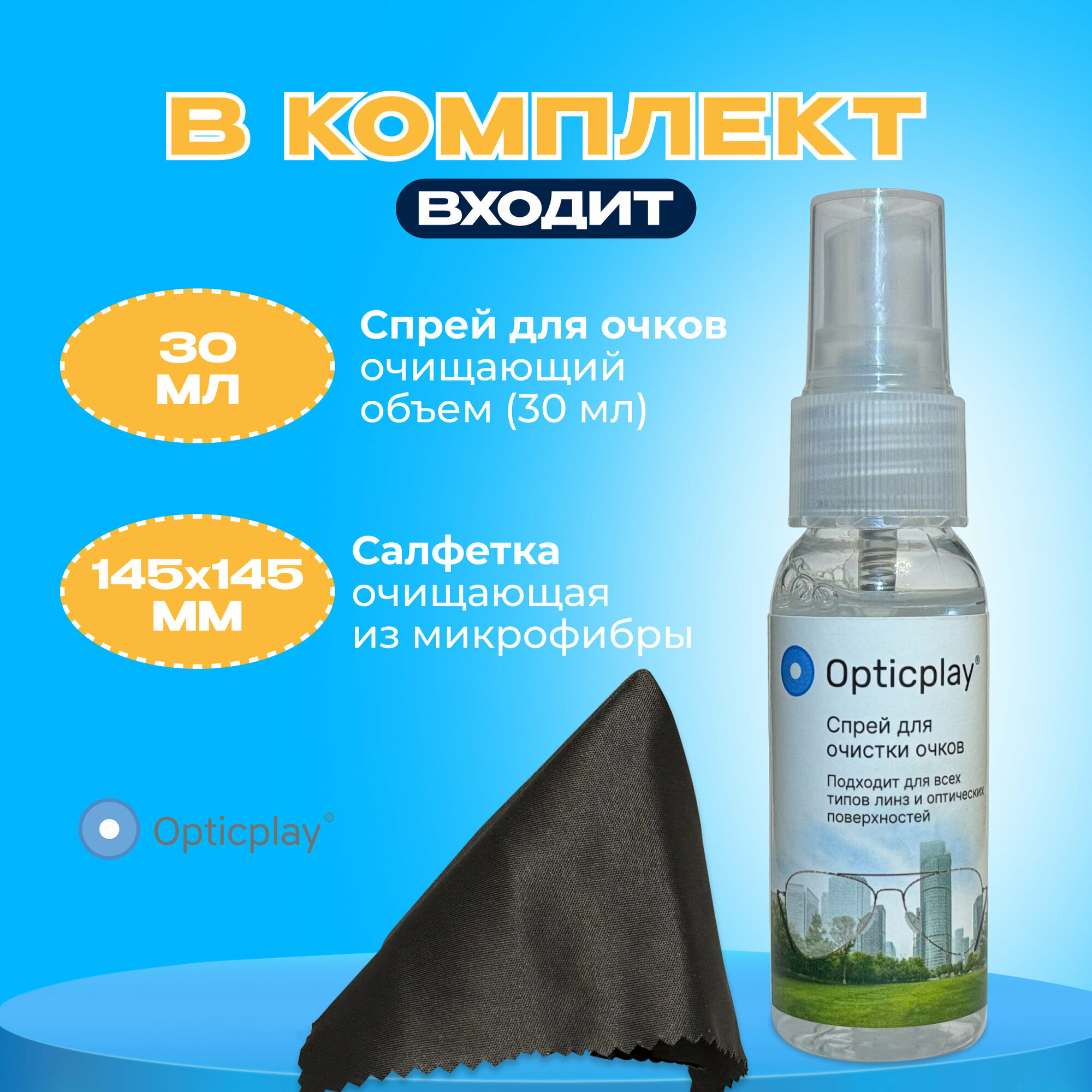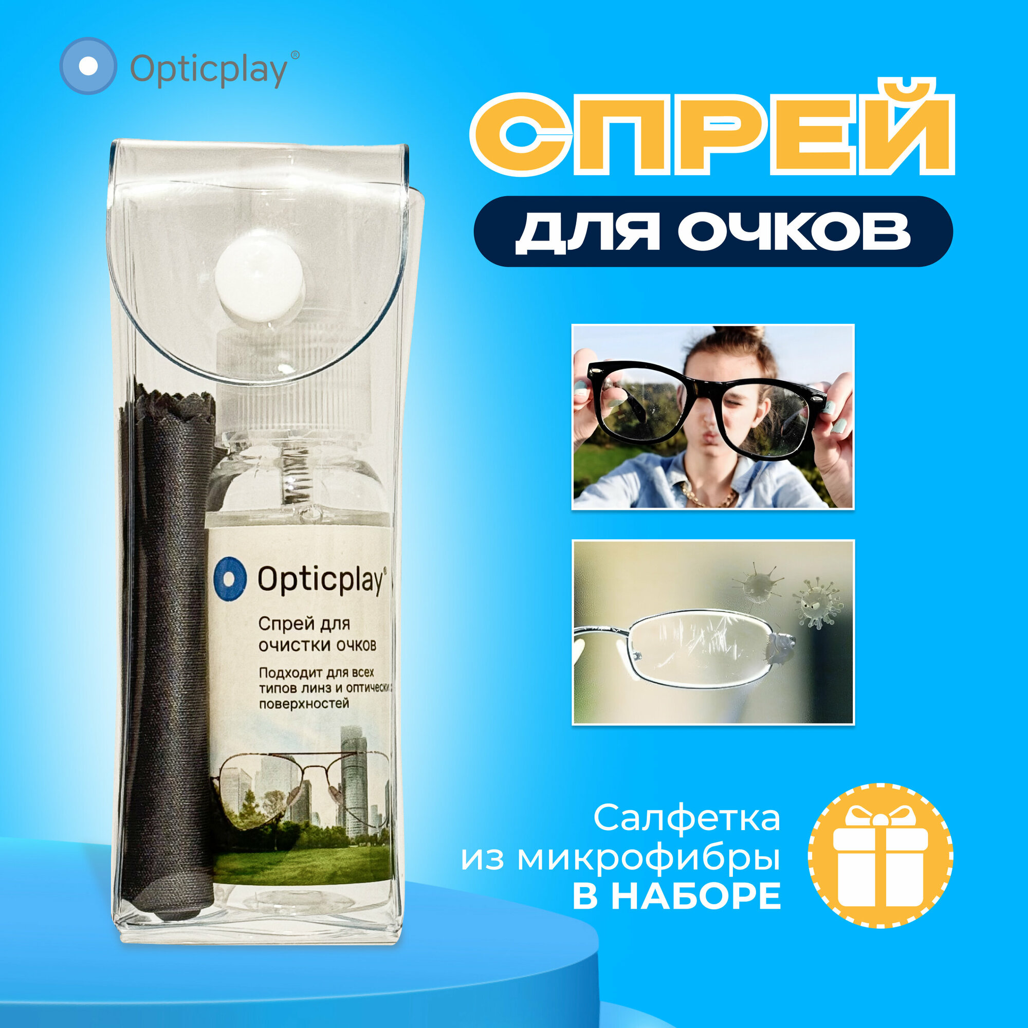 10 цен на Спрей для ухода за очками Оптикплей + салфетка из микрофибры + футляр