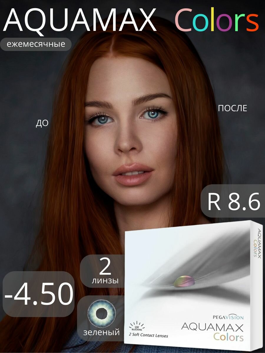 10 цен на Цветные линзы Pegavision Aquamax Colors 2 линзы R 8.6 SPH -4.50 Green (зеленые) D 14.2, ежемесячные