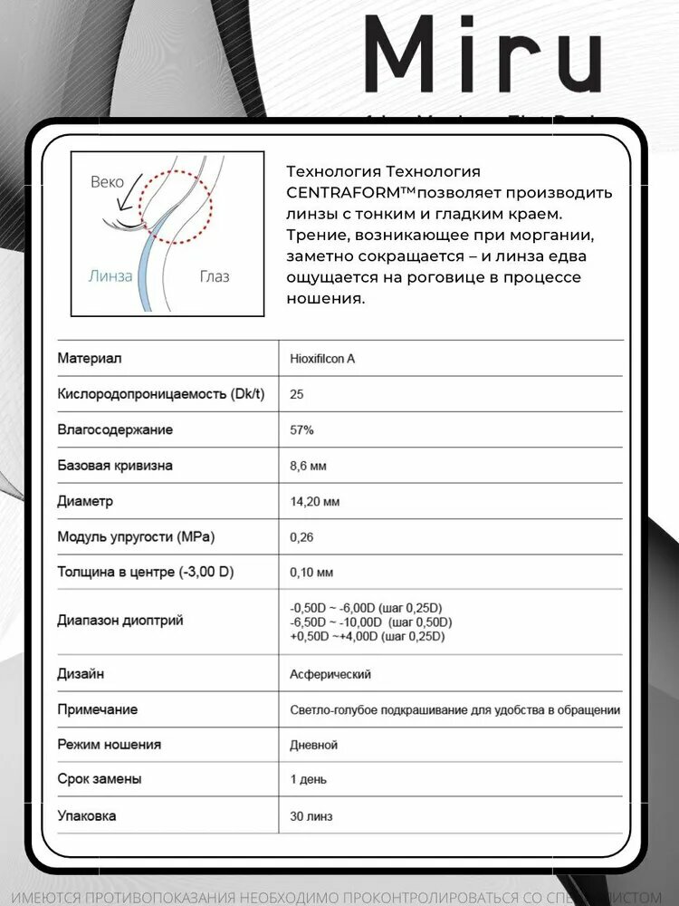 | Дополнительная информация | Контактные линзы Miru 1day отличаются высокой оптической точностью, изготовлены из устойчивого к дегидратации, биосовместимого материала Хайоксифилкон А (HEMA-GMA Hioxifilcon A) с хорошо смачиваемой поверхностью для максимально комфортного использования в течение дня. |