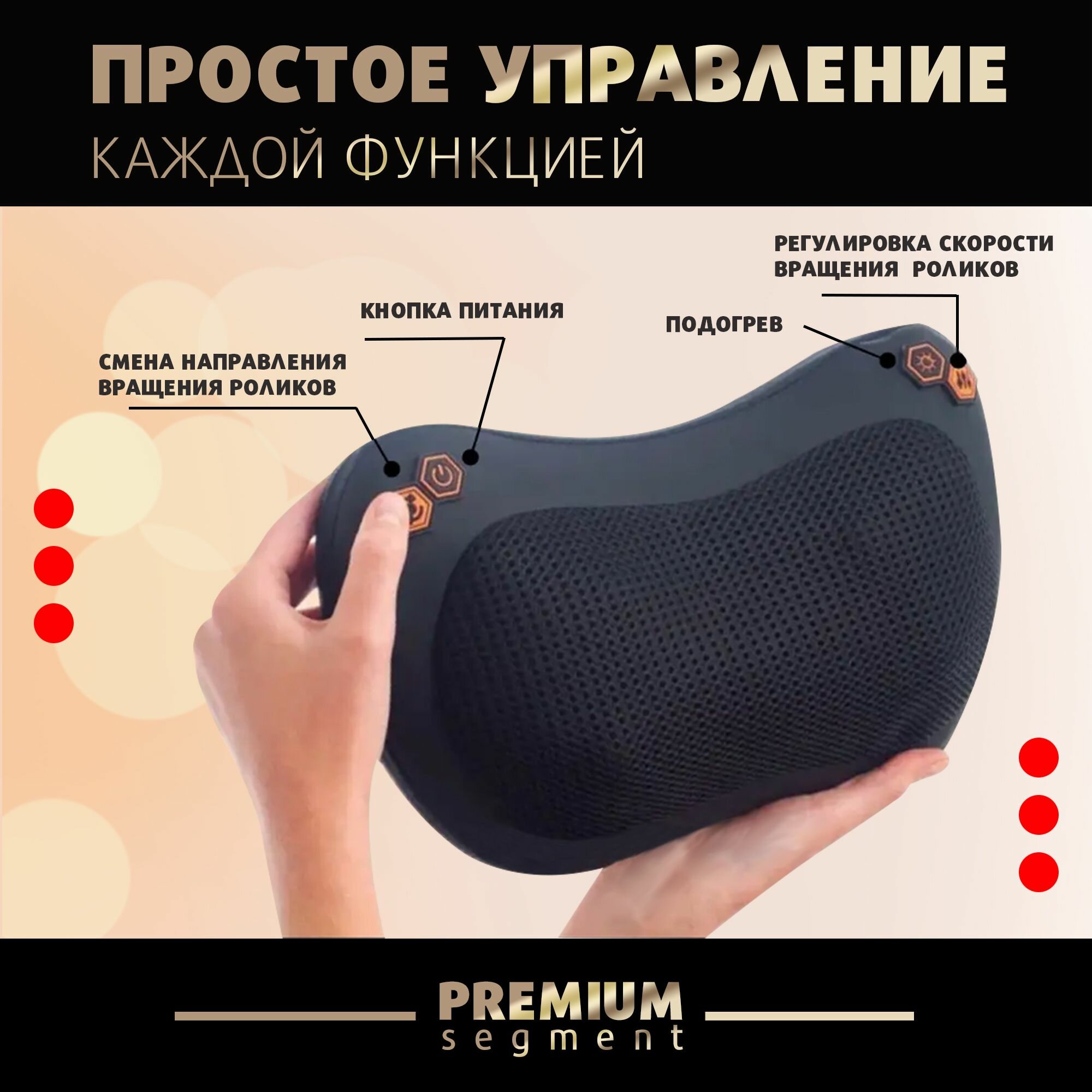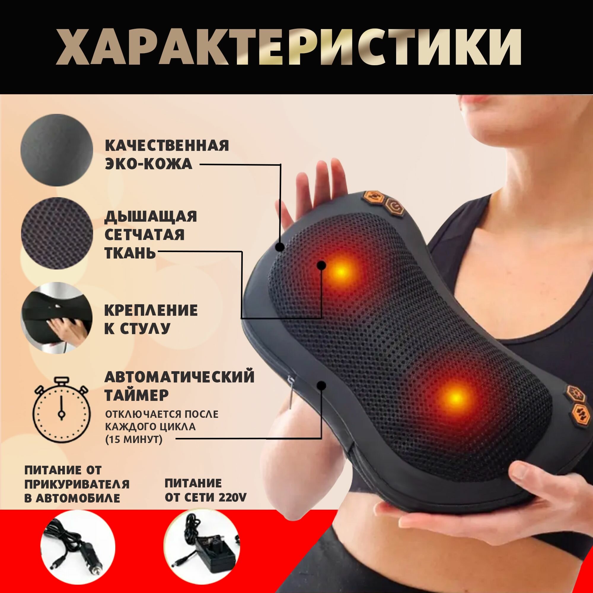 | Дополнительная информация | 1. Подключите к сети. 2. Нажатие один раз - включает массажер. 3. Нажатие два раза - включает подогрев. 4. Нажатие три раза - отключает массажер. Подушка работает от сети или через автомобильный прикуриватель (12 В). |