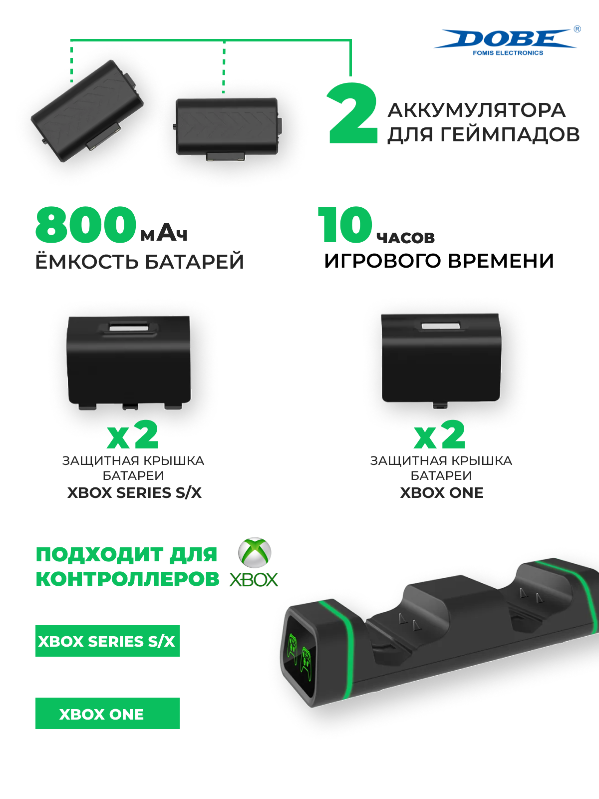 Зарядная станция Dobe Xbox Series S/X - Xbox One Dual Charging Dock + 2шт АКБ 800mAh TYX-19006X информация: