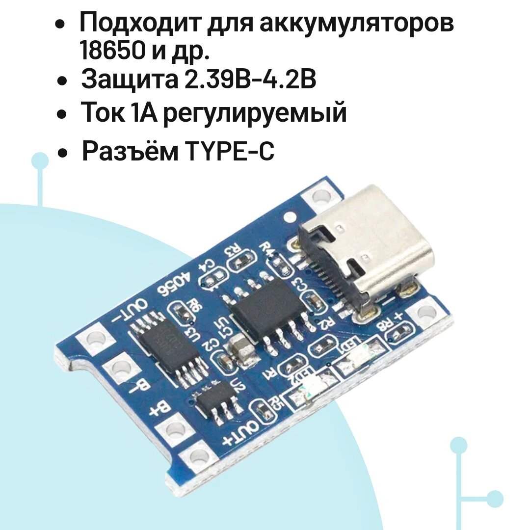 Электронный модуль, микросхема TP4056 для зарядки литиевого аккумулятора 18650 1A с защитой с TYPE-C портом. информация: