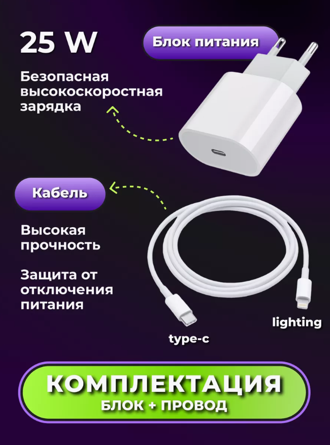 | Подробная комплектация | Сетевой адаптер питания 25W -1 шт. Кабель USB-C (Type-C) - Lightning - 1шт. |