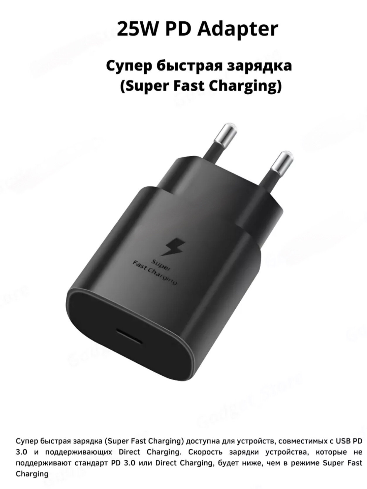 Адаптер для Samsung 25W USB-C + Кабель Type-C (5A), быстрая зарядка, черный информация: