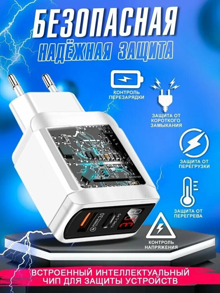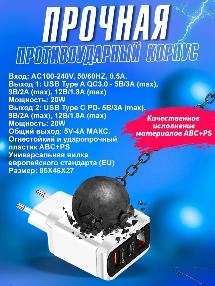 Зарядное устройство для телефона 1USB+PD20W с кабелем TYPE-C 1 метр samsung, honor, xiaomi, realme, быстрая зарядка для iphone, белая информация: