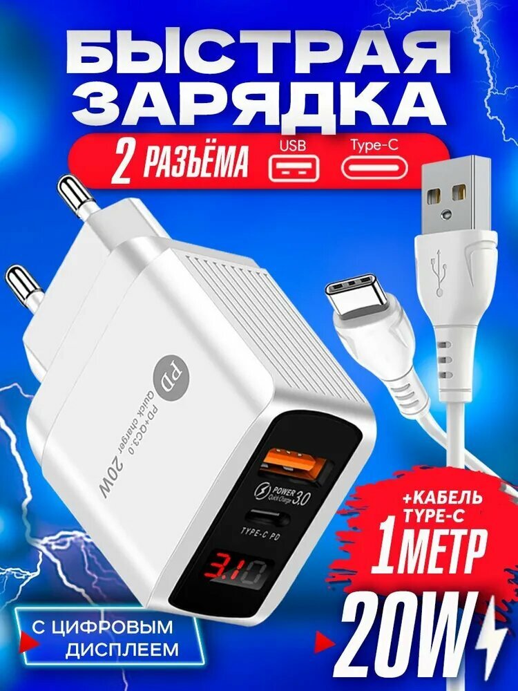 Отзывы на Зарядное устройство для телефона 1USB+PD20W с кабелем TYPE-C 1 метр samsung, honor, xiaomi, realme, быстрая зарядка для iphone, белая