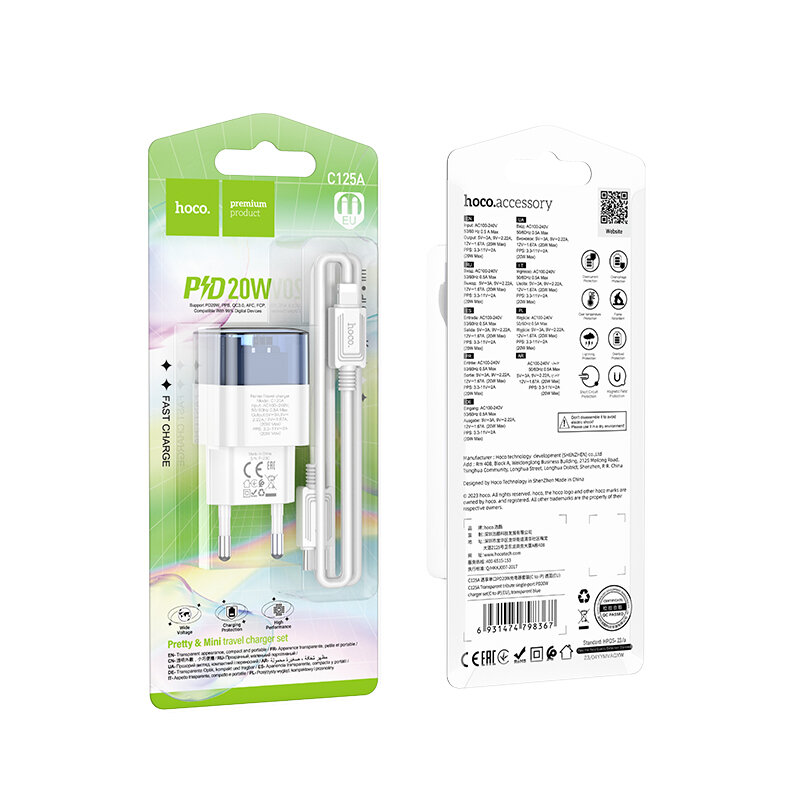 Сетевое зарядное устройство Hoco C125A, Type-C, 20 Вт, прозрачное, Type-C - Type-C, синий информация: