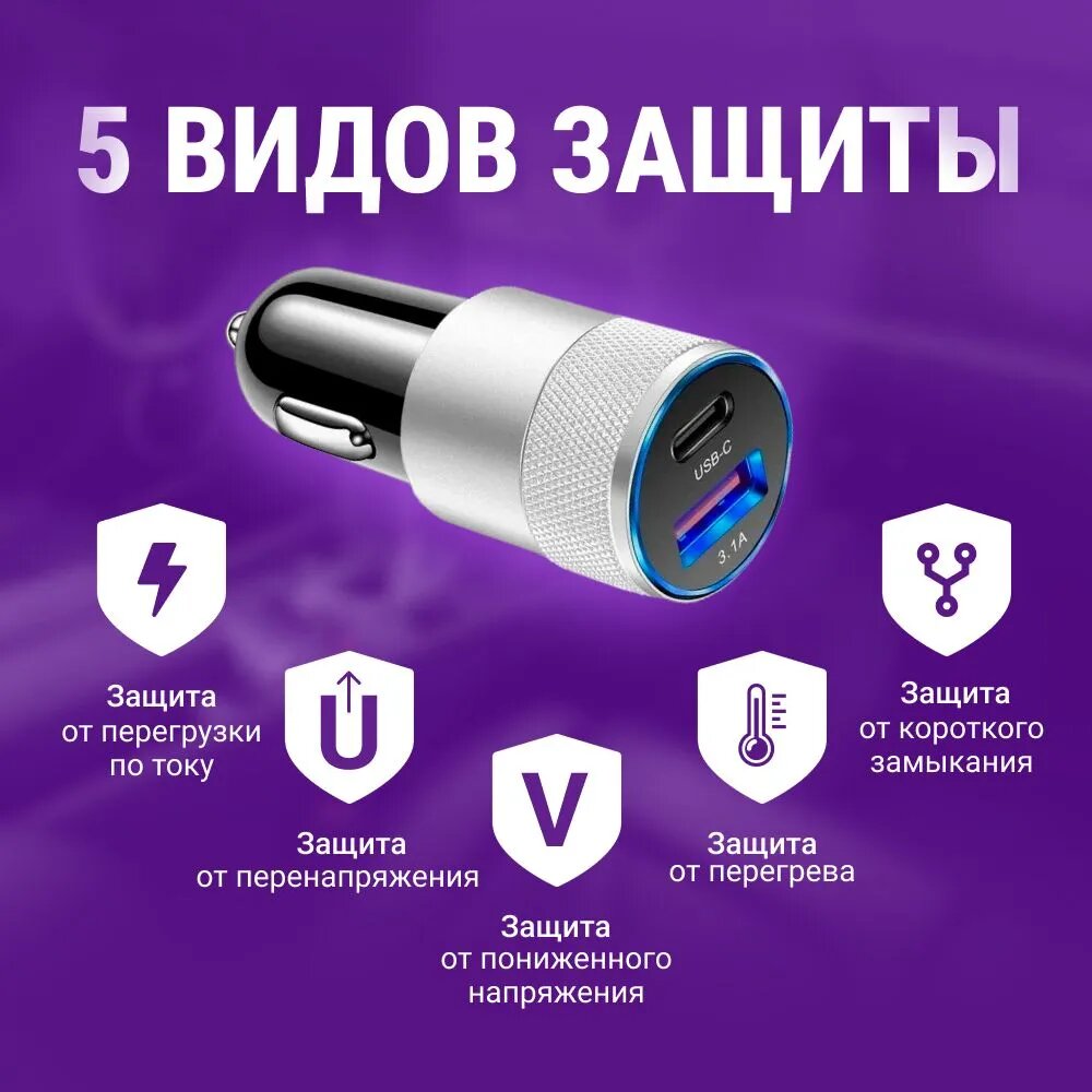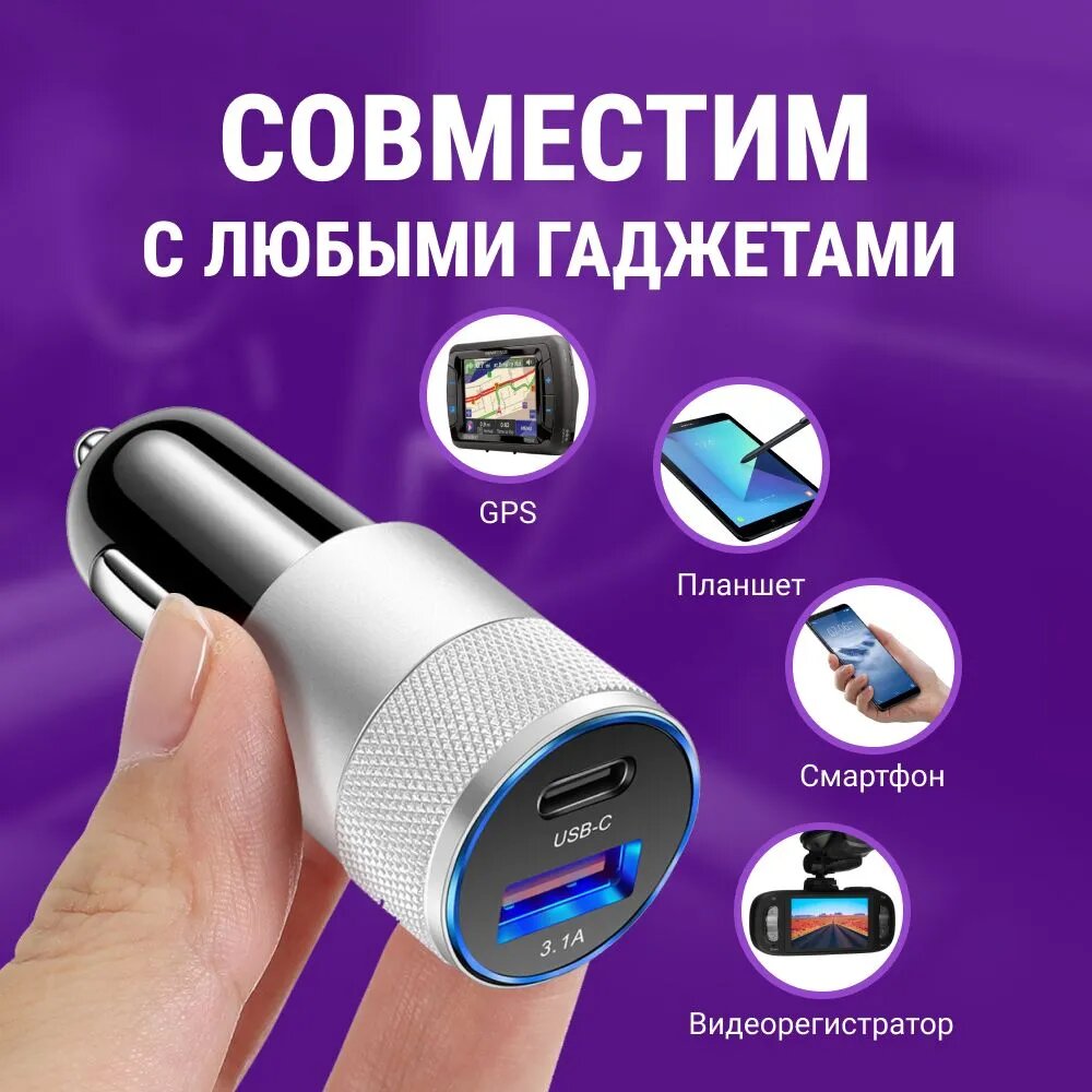 10 цен на USB переходник адаптер в прикуриватель с быстрой зарядкой, Type A и Type C (серебристый)