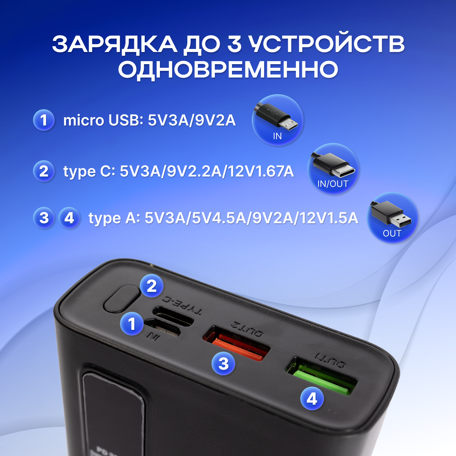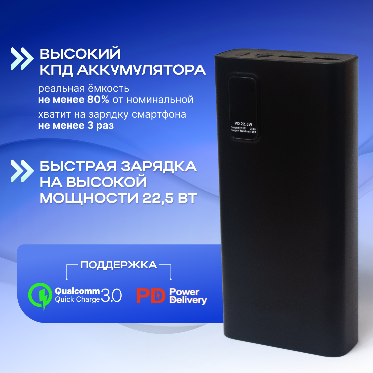Повербанк (power bank) 20000mah с быстрой зарядкой, внешний аккумулятор для телефона iPhone, Xiaomi, Samsung, черный информация:
