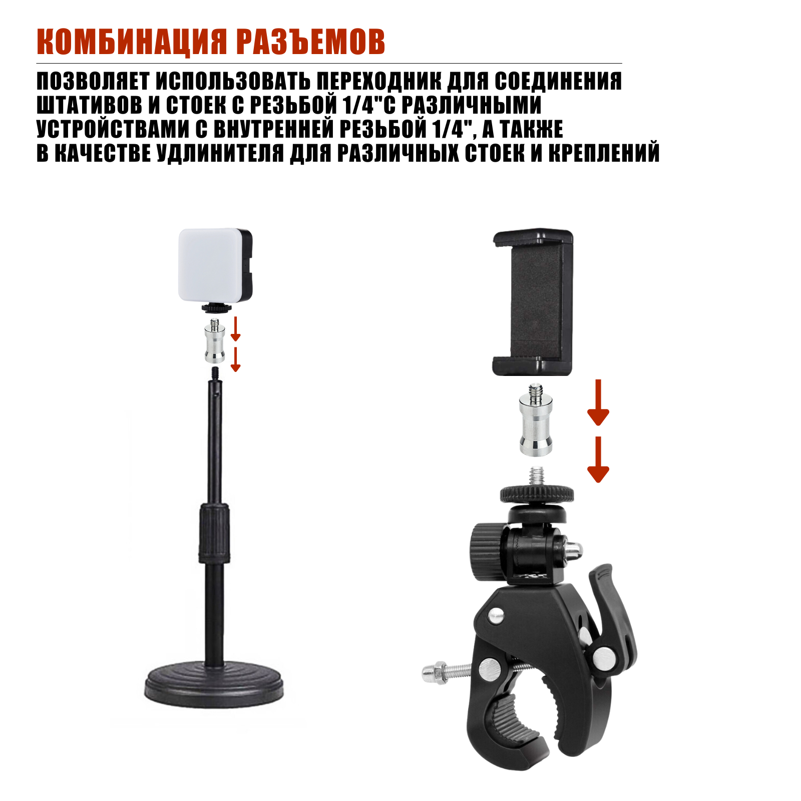 | Дополнительная информация | Адаптер-переходник 1/4"(F)-1/4"(M) – это универсальный аксессуар, который позволяет легко и быстро присоединить кольцевую лампу, камеру, светильник или другое оборудование с разъемом 1/4" к штативам, стойкам или другим устройствам с разъемом 1/4" |