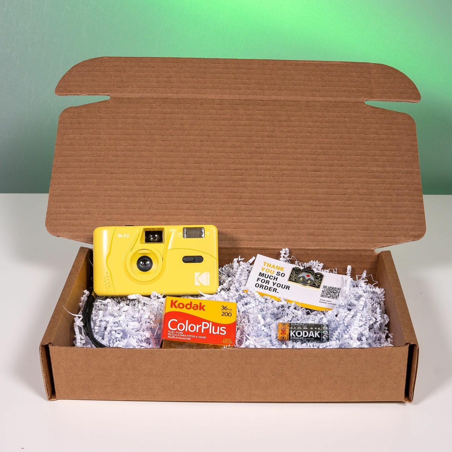 | Комплектация | Подарочный набор включает: – Фотоаппарат Kodak M35 – Фотопленка Kodak ColorPlus 200 на 36 кадров – Ремешок на руку – 2 батарейки Kodak AAA (1 для вспышки, 1 запасная) – Красивый значок пин – Крафт коробка с подарочным наполнителем |