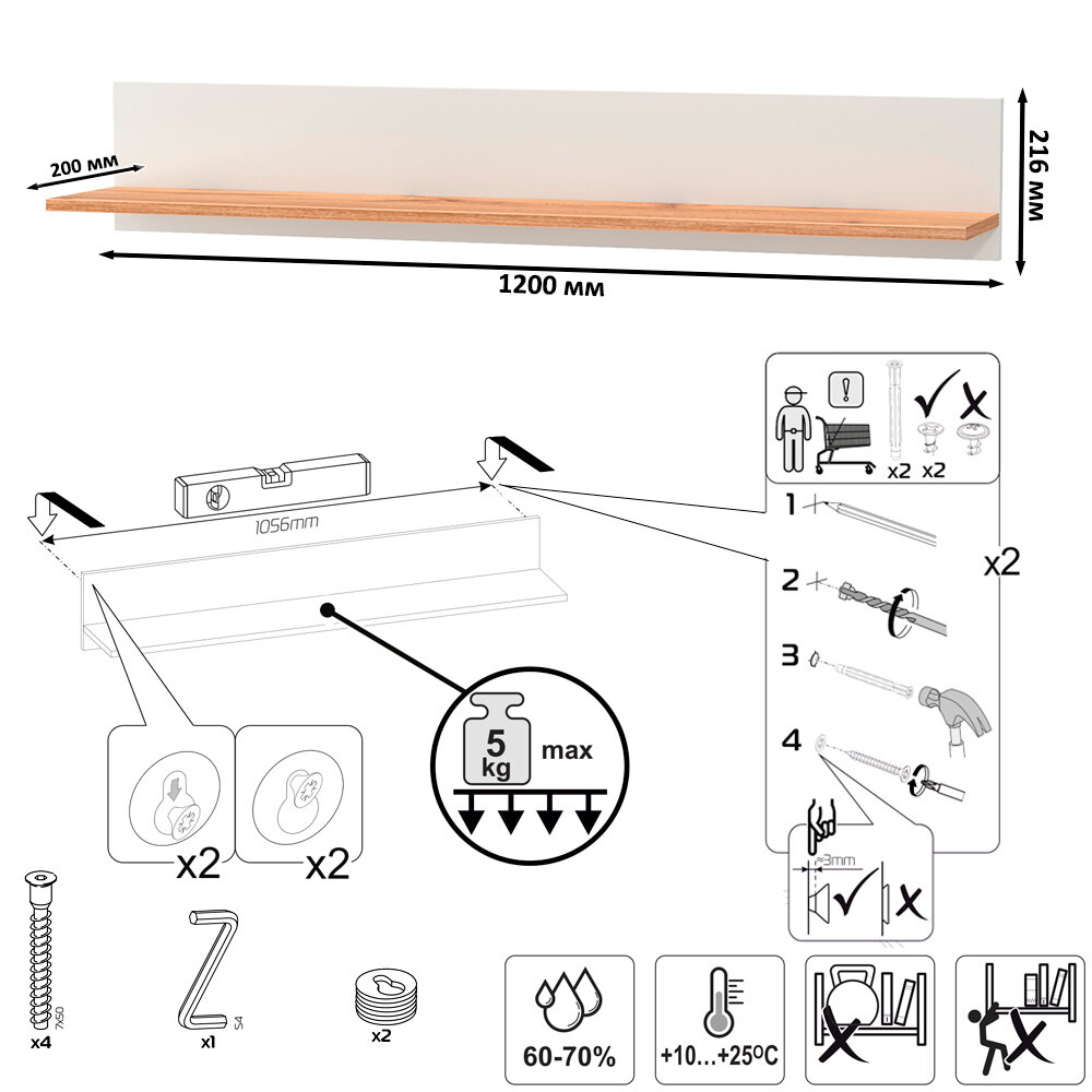| Дополнительная информация | настенная открытая полка с задней панелью, полка располагается по центру панели; можно использовать как книжную, а также для размещения элементов декора, поделок и фоторгафий; имеет с обратной стороны панели скрытые крепленния; максимальная нагрузка на полку составляет 5 кг; поставляется в разобранном виде |