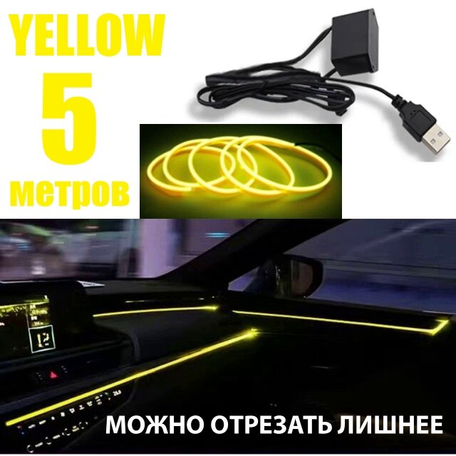 10 цен на Неоновая нить для подсветки салона авто, светодиодная лента в машину в салон, в USB 5 Вольт, 5 метров, желтый, неоновая нить в авто