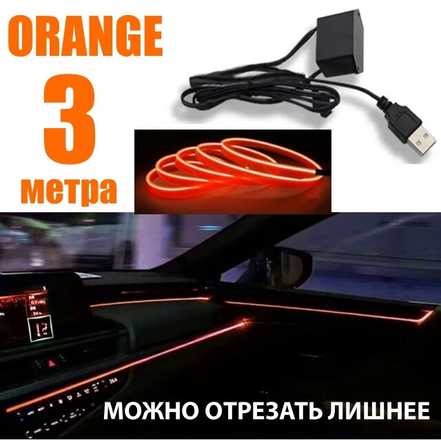 10 цен на Лента неоновая для автомобиля, неоновая нить в авто, в USB 5 Вольт, 3 метра, оранжевый, светодиодная лента подсветка для машины на панель и торпеду