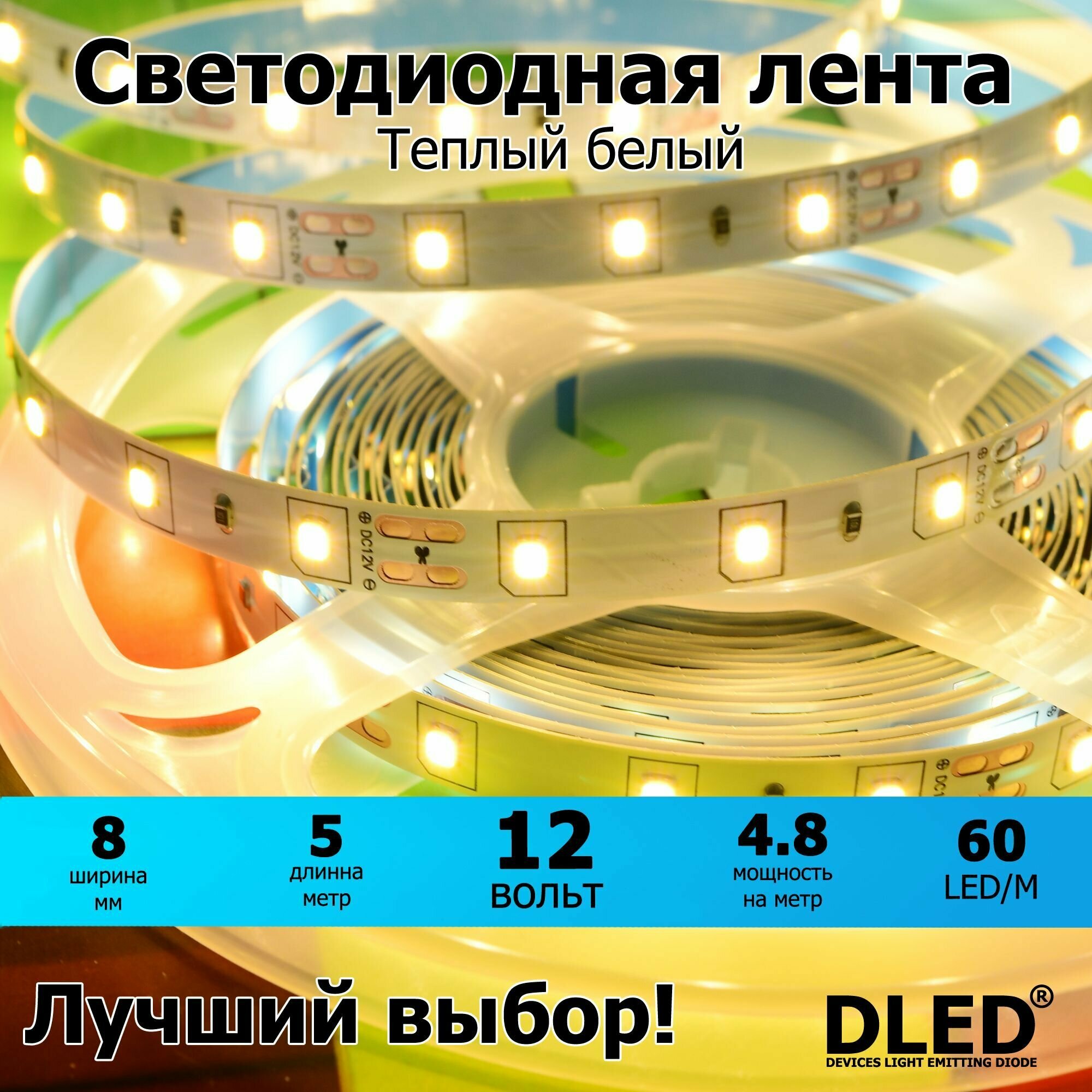 10 цен на LED лента 5м IP22 SMD 2835 (60 LED/M) 12V DC DLED Теплый Белый 3300K