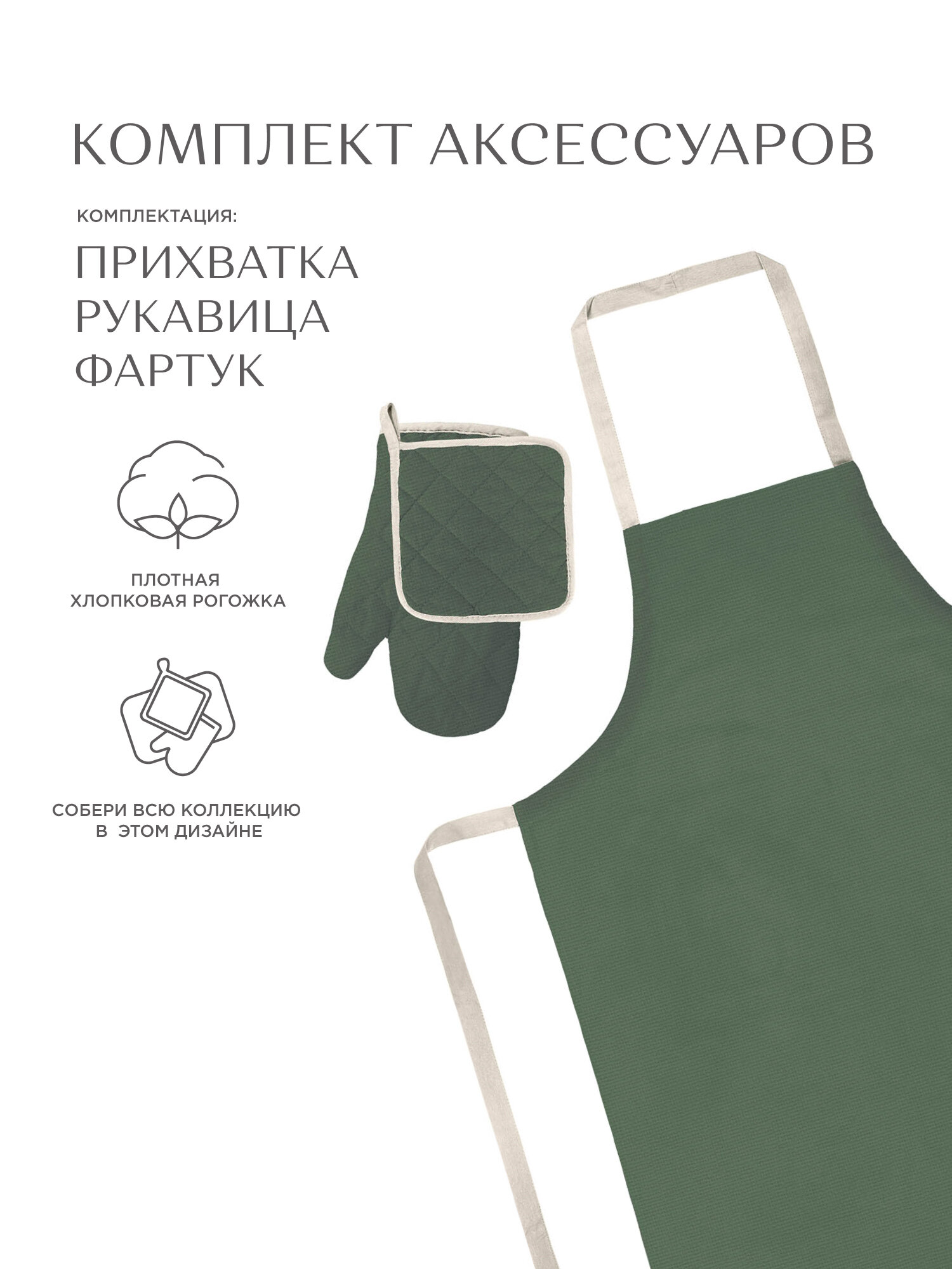 10 цен на Комплект кухонный рогожка (прихватка 18х18, прихватка-рукавица 18х28, фартук 60х70) "Унисон" рис 30004-20 Basic серо-зеленый