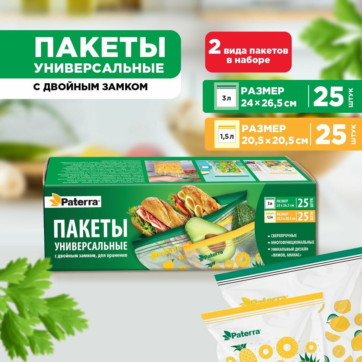 Пакеты универ 25 шт-20.5х20.5 см,25 шт-24х26.5 см с двойн замком 50 шт/уп Лимон,ананас PATERRA информация: