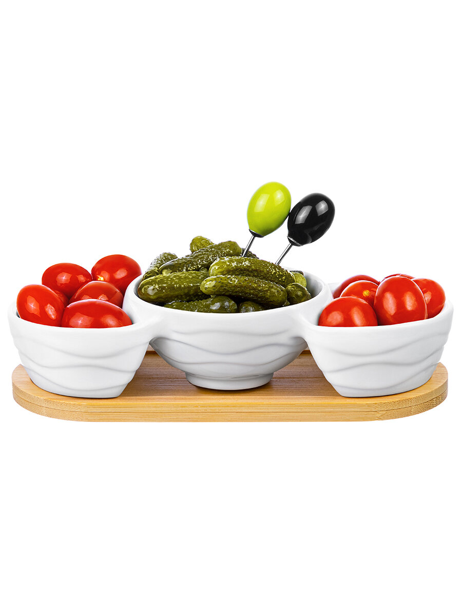 Отзывы на Блюдо - менажница фарфоровая с 3 секциями 22х9,5х5,8 см Elan Gallery Айсберг волны на деревянной подставке с 2 шпажками