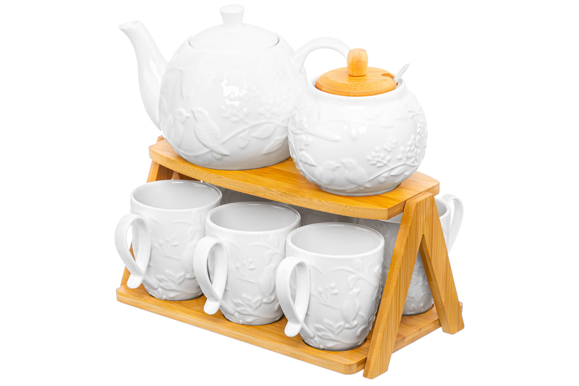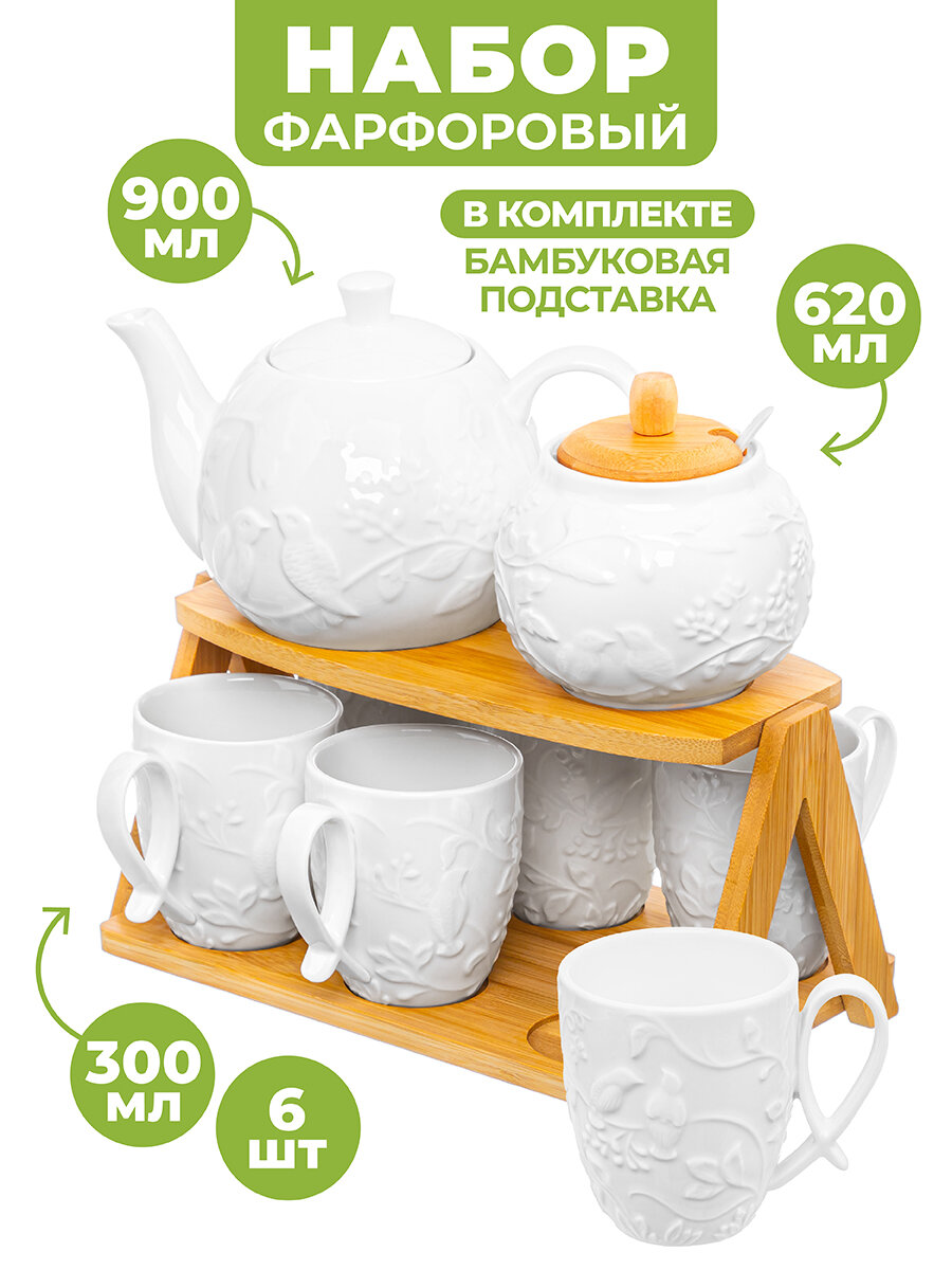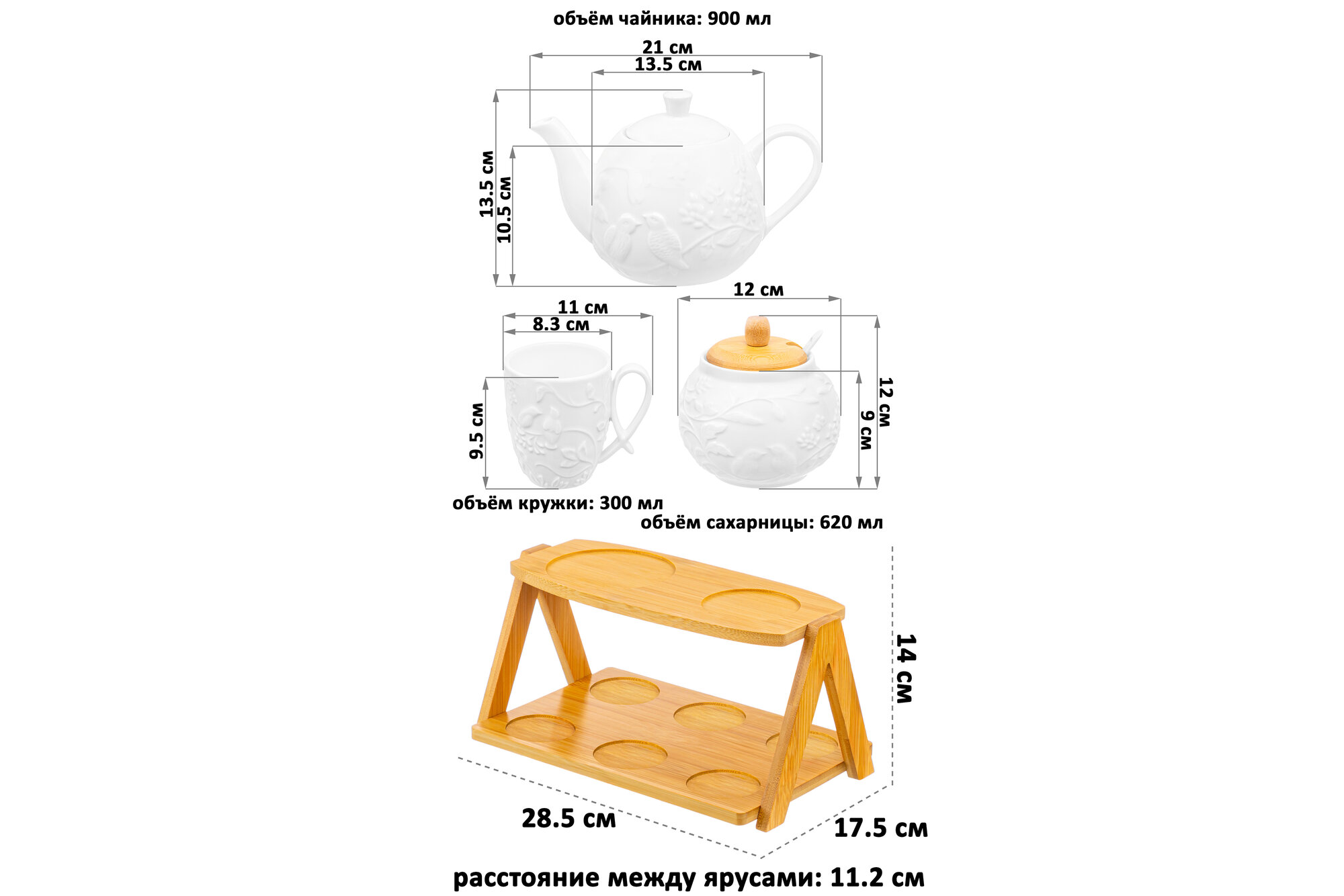 | Дополнительная информация | Набор "Птички на ветке" - чайник 21х13,5х13,5 см 900 мл, высота без крышки 10,5 см, внутри чайника - дырочки в носике, сахарница 12х12х12 см с дер. крышкой и с ложкой, 620 мл, высота без крышки 9 см, 6 кружек 11х8,3х9,5 см 300 мл - каждая, на бамбуковой подставке 28,5х17,5х14 см (расстояниеи между ярусами 11,2 см) |
