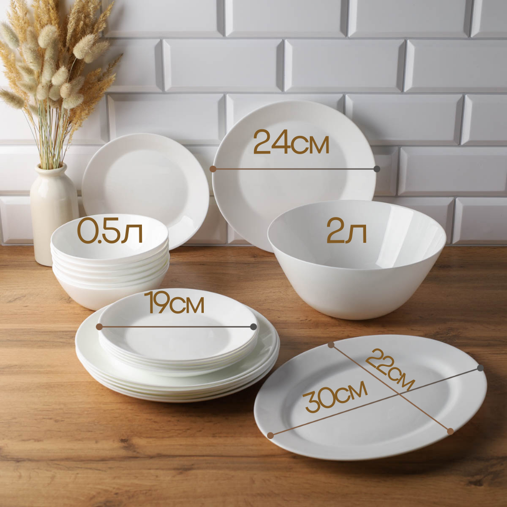 | Комплектация | 6шт глубоких тарелок 500мл, 6шт плоских тарелок 19см, 1шт салатник 1 литр. |