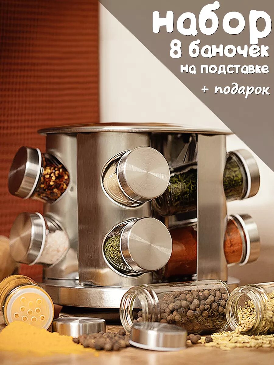 Набор стеклянных баночек из 8 шт на вращающейся подставке круглый металл информация: