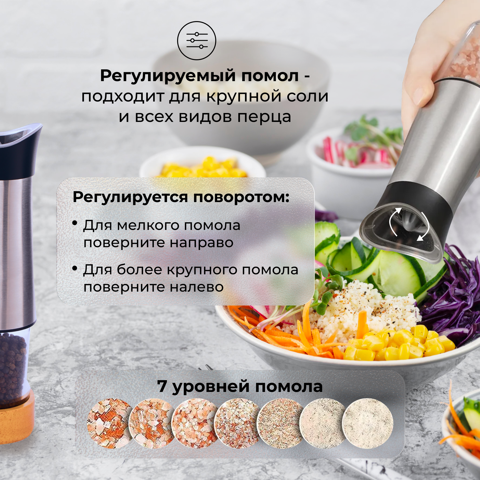 Мельницы для специй с гравитационным механизмом и 7 уровнями помола информация: