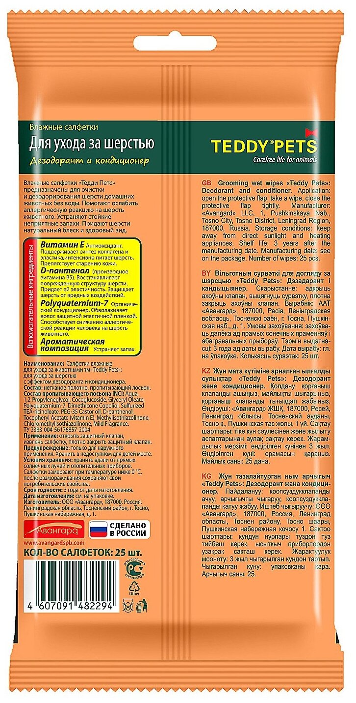 Teddy Pets Влажные салфетки для ухода за шерстью Дезодорант+кондиционер (25 шт) информация: