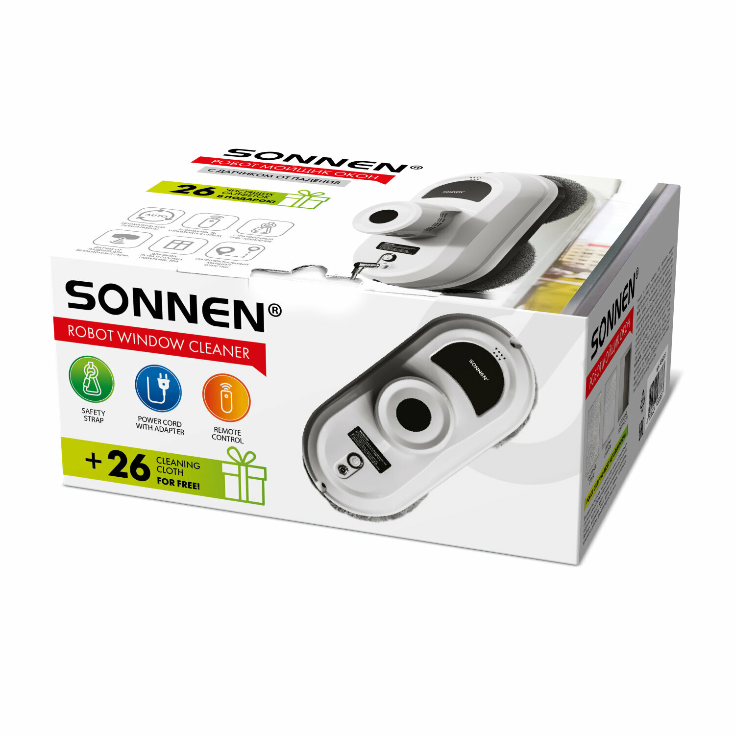 Робот-мойщик окон SONNEN Tech RWC-122 UltraClear, датчик от падения, 26 салфеток, пульт ДУ, 456235, в комплекте 1шт информация: