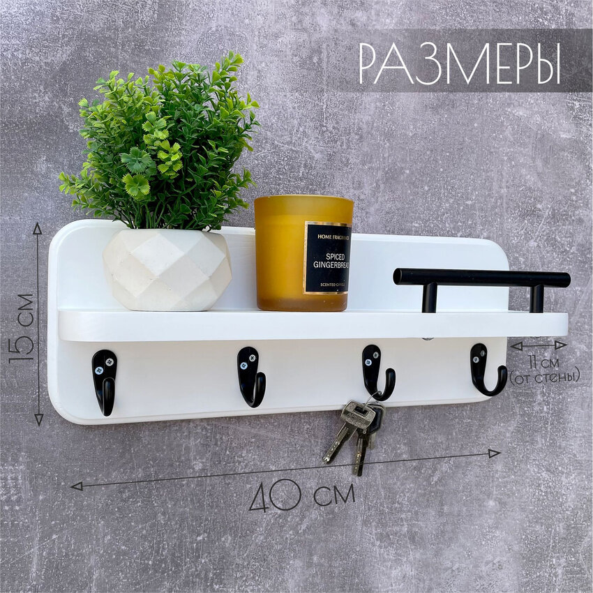 Полка настенная с крючками белая Ключница на стену деревянная информация:
