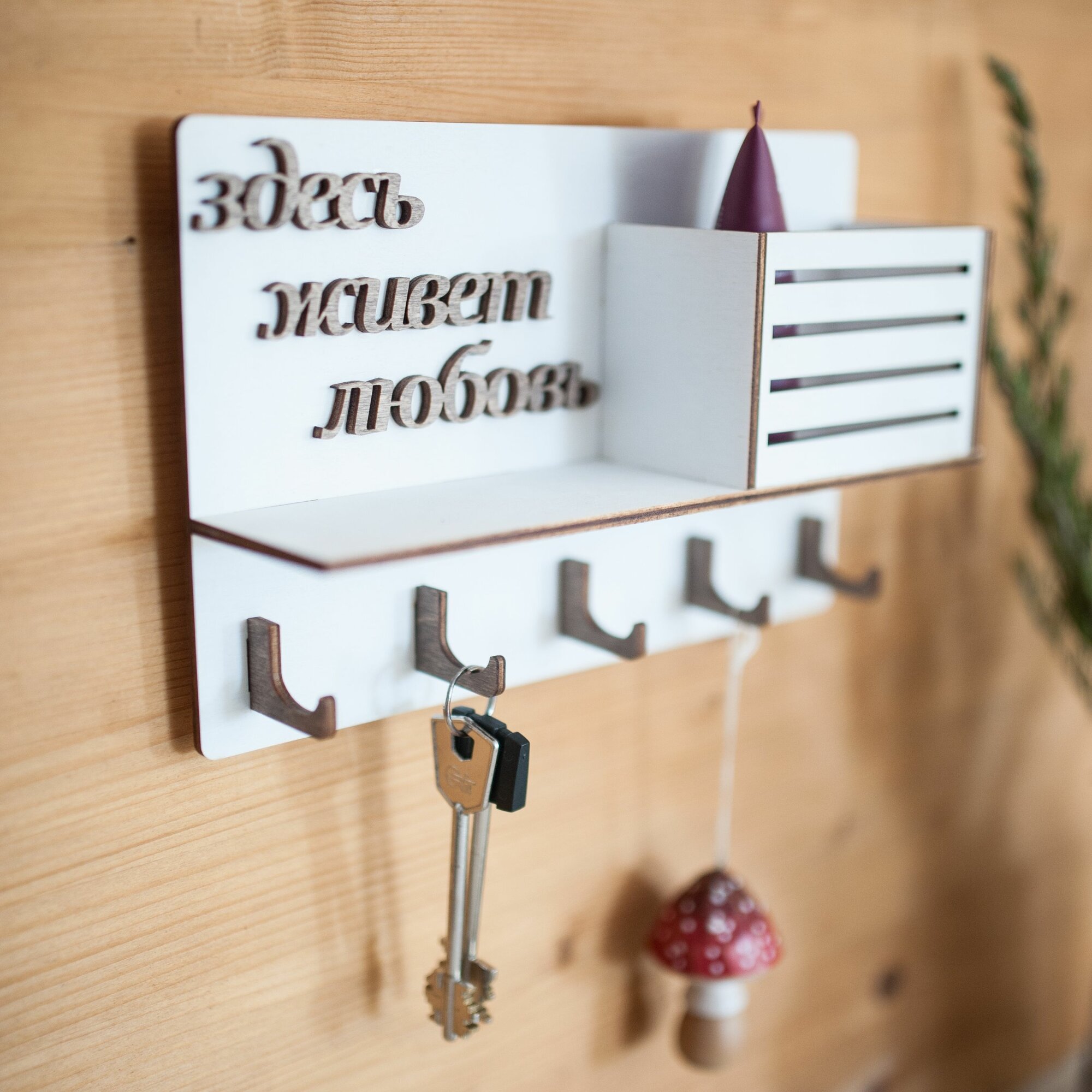 Отзывы на Ключница настенная деревянная Bezusoff с 5 крючками и полочкой, надпись Здесь живет любовь. Цвет белый, размер 25 см на 16 см.