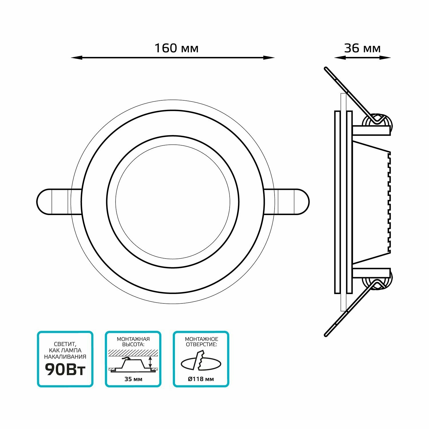 Светильник Gauss, круглый с декоративным стеклом, 160х30, Ø118, 12W 3000K, 900лм 878 ₽