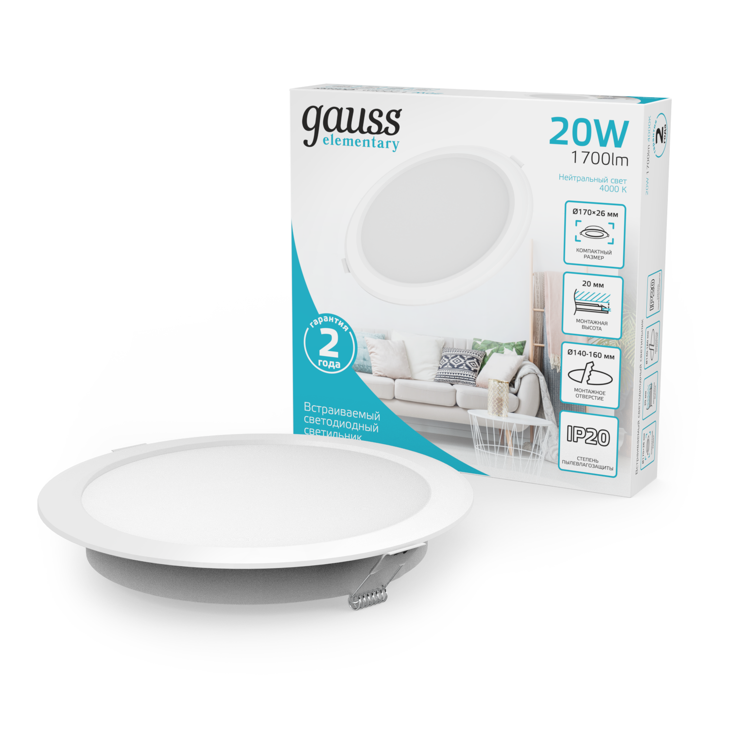 Светильник потолочный встраиваемый Downlight круг 20W 4000K 220V IP20 170*26 белый Gauss Elementary 1 188 ₽