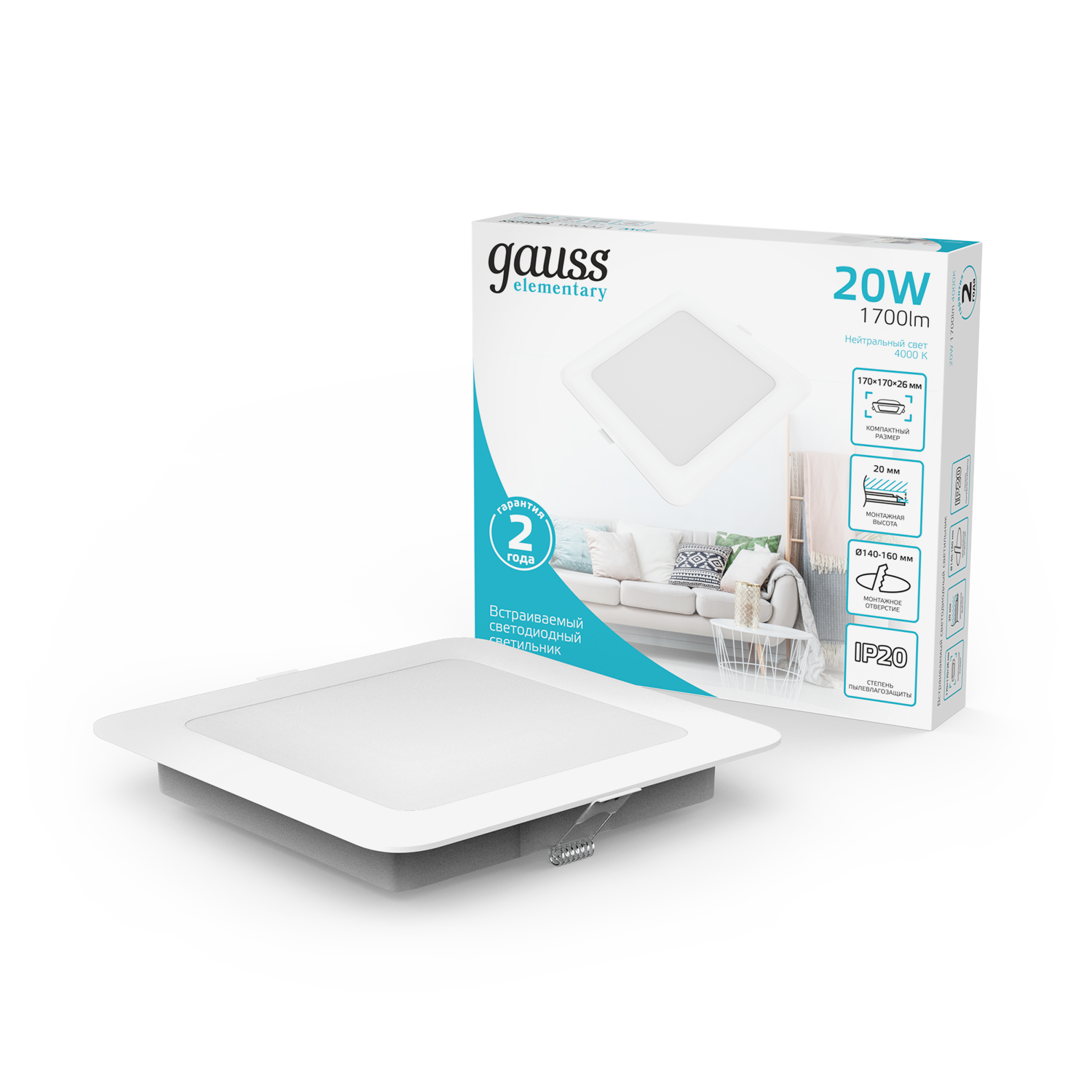 Светильник потолочный встраиваемый Downlight квадр 20W 4000K 220V IP20 170*26 белый Gauss Elementary 1 269 ₽