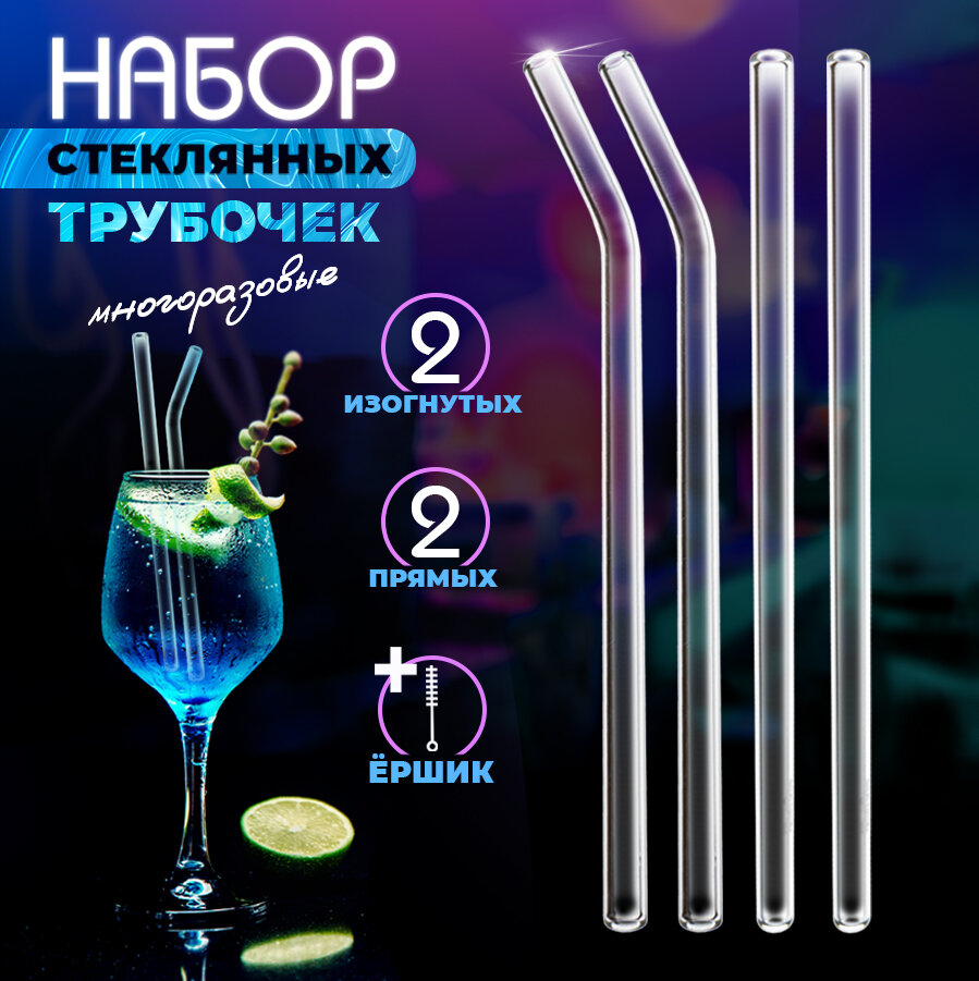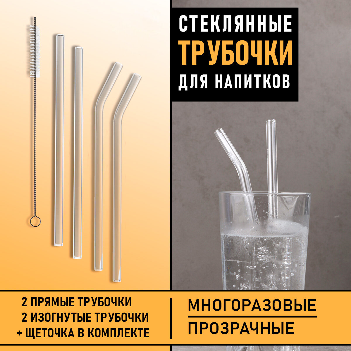 Отзывы на Многоразовые стеклянные эко-трубочки All in One для коктейлей, напитков с ёршиком, прямые/изогнутые, прозрачные, 4+1