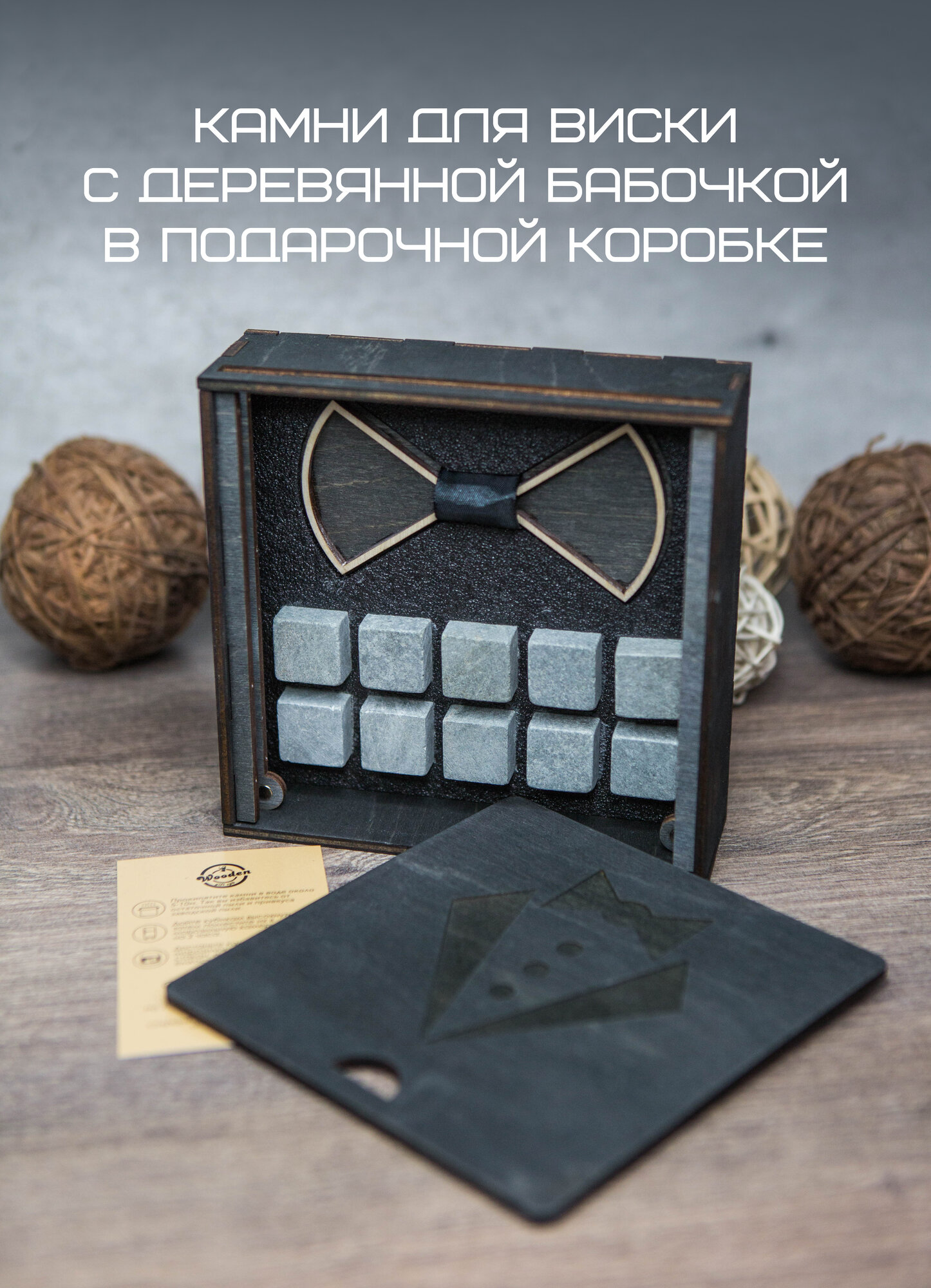 Камни для виски с деревянной бабочкой в подарочной коробке информация: