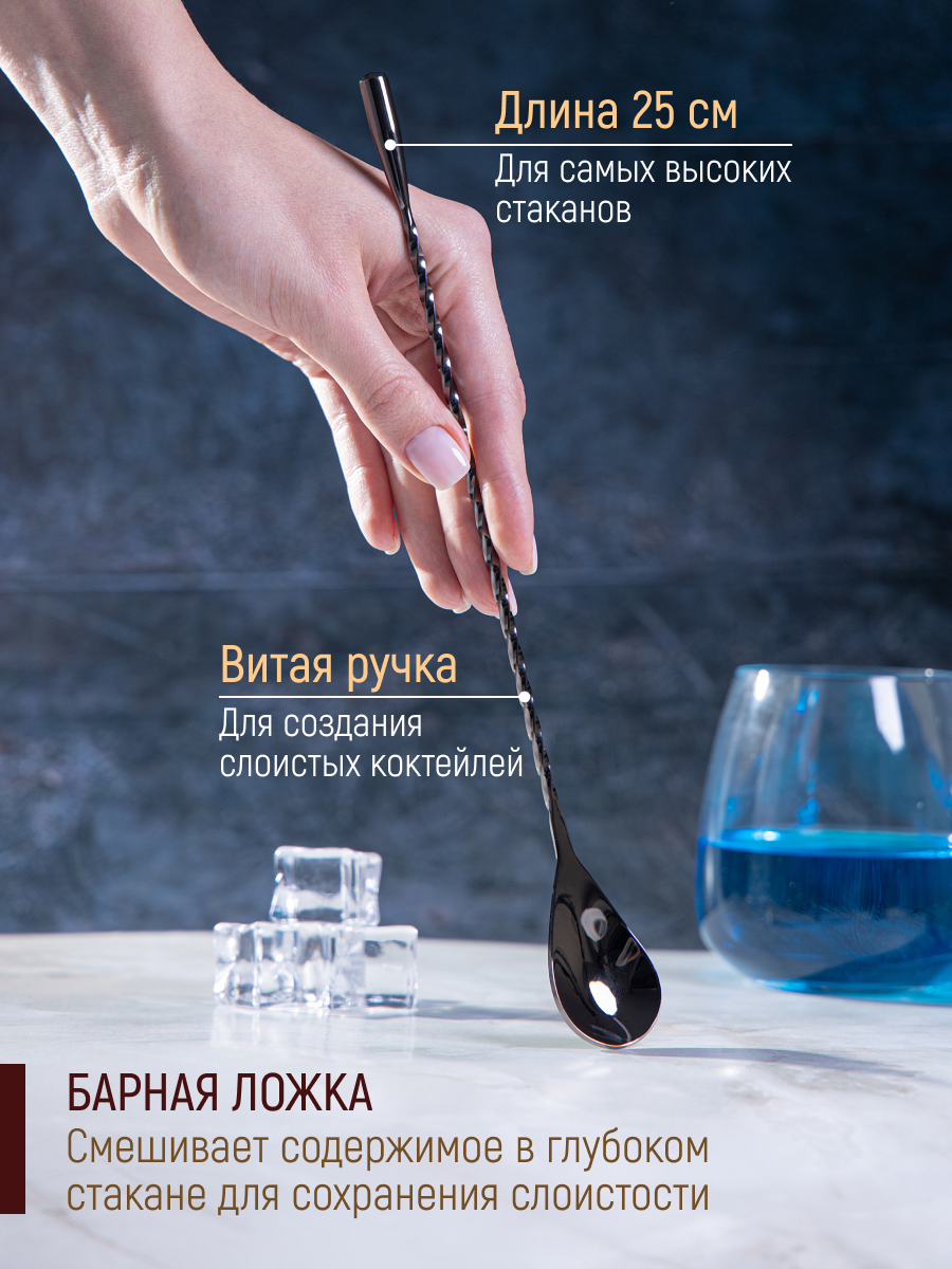 | Подробная комплектация | шейкер для коктейлей, мадлер. стрейнер, элегантная двухсторонняя барная ложка два барных гейзера на бутылки, барное сито для фильтрации от остатков фруктов, три сиропа книга с 14 рецептами коктейлей, подарочная упаковка |