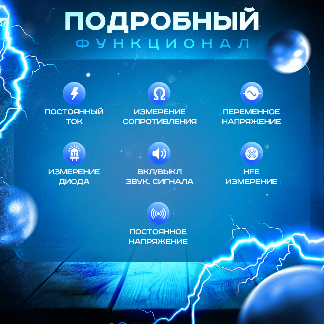 | Функции | выявление повреждения проводки и соединения, измерение емкости конденсаторов, измерение переменного напряжения, измерение постоянного напряжения, измерение проводимости, измерение работоспособности диодов и транзисторов, измерение силы переменного тока, измерение силы постоянного тока, измерение сопротивления |