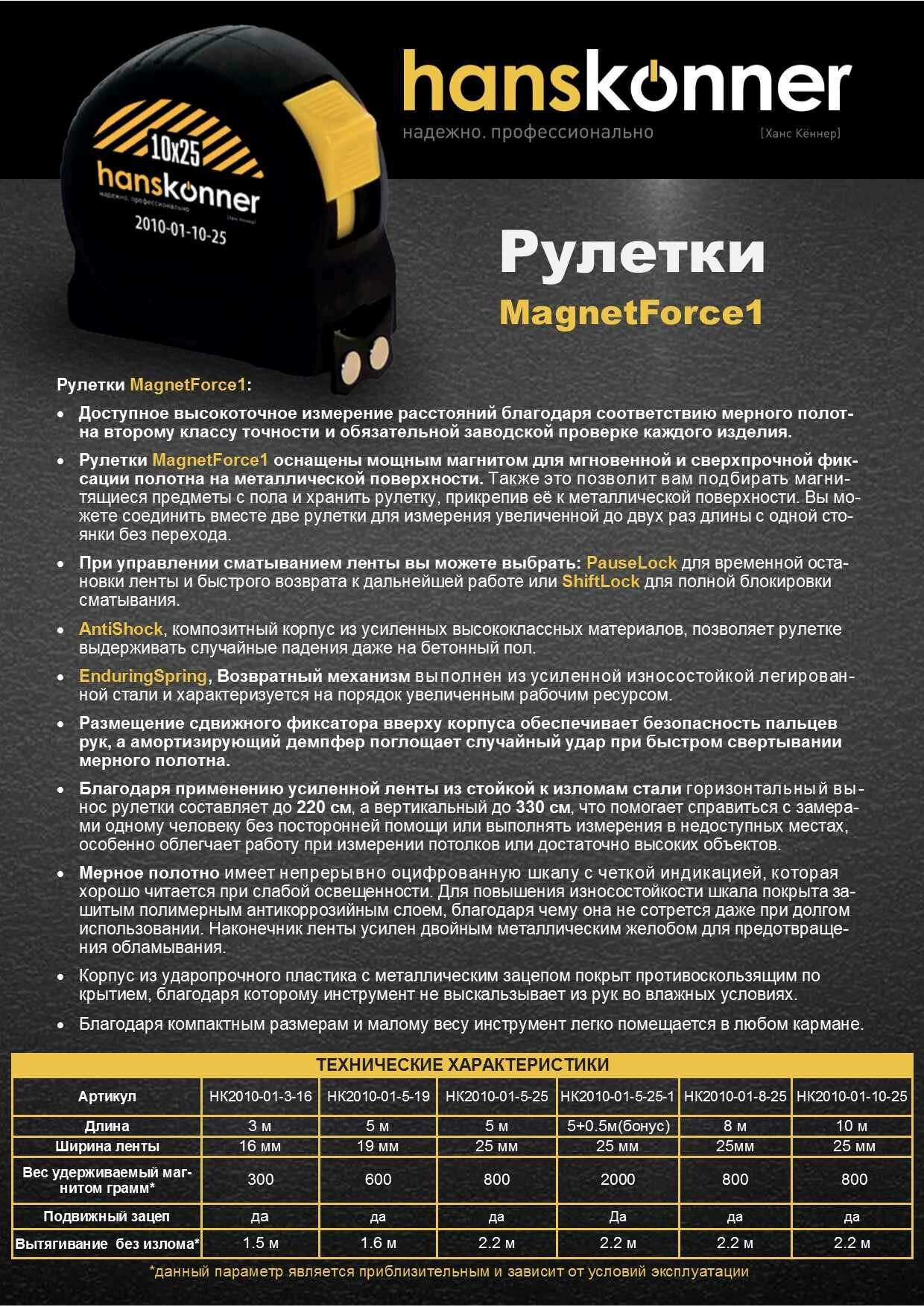 Рулетка 8x25мм, 2 стопа, корпус SoftTouch, супермощный магнит, Hanskonner информация: