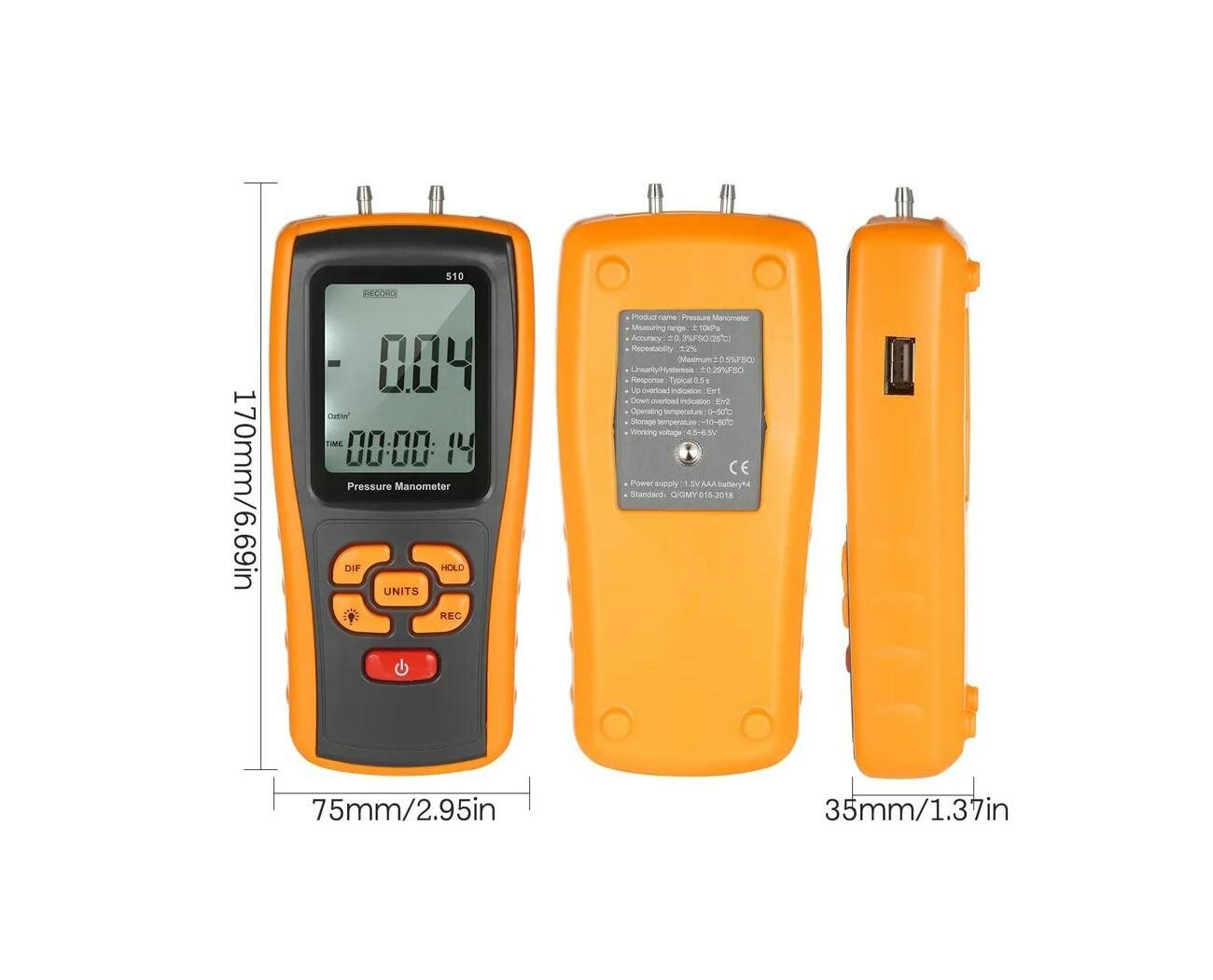 Цифровой портативный дифференциальный манометр HT-GM.510 (LCD) (W4582RU) для измерения разностного давления газовых сред (воздуха, воды) информация: